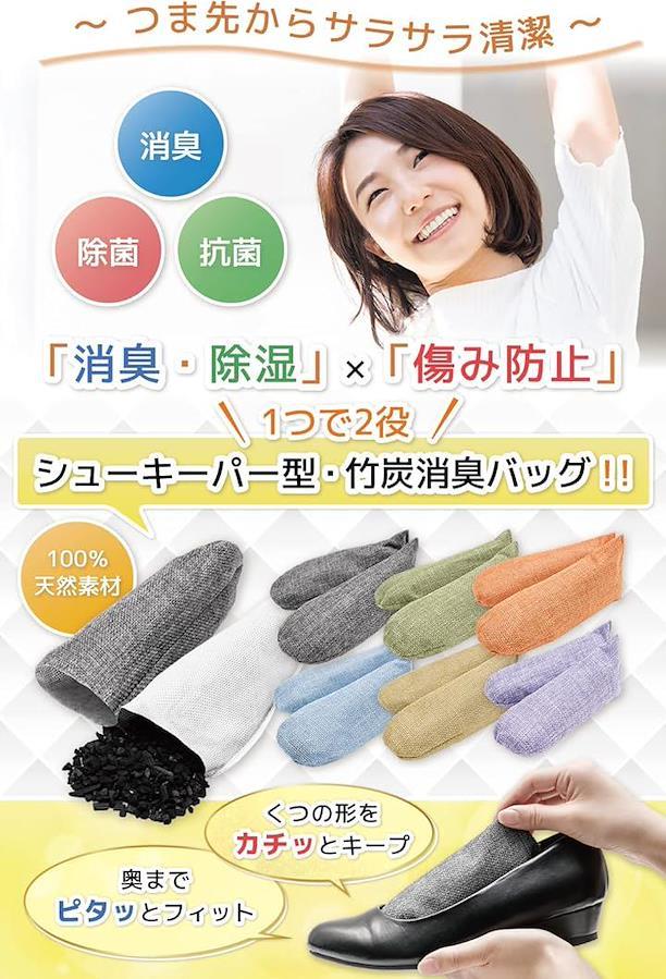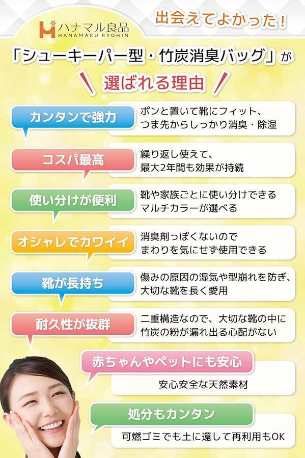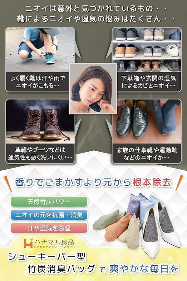 「ハナマル良品 シューキーパー型 靴 消臭 脱臭 竹炭 バッグ セット内容」(1)竹炭バッグ「75g/個」(サイズ:約縦16cmx幅6.5cmx厚さ8cm/個)、(2)説明書(脱臭・除湿の効果アップ実践法付き)