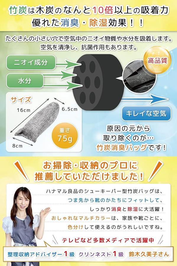 「消臭・除湿・抗菌 ニオイのモトから根本除去」 ハナマル良品の竹炭バッグは、 消臭 脱臭 除湿 効果を発揮するため、厳選された高品質の優れた竹炭のみを使用。木炭や備長炭の10倍の吸着力でニオイのモトから根本除去。天然の竹炭ですので、香でごまかす 消臭剤 とは違い、 無臭 でイヤなニオイと混ざることなく自然で爽やかな環境でご使用いただけます。