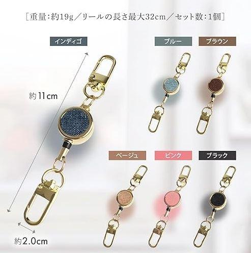 「商品仕様」サイズ:11x2x1cm、リールの長さ最大32cm、重量:約19g、セット数:1個、金具:ゴールド、カラーバリエーション:全6色