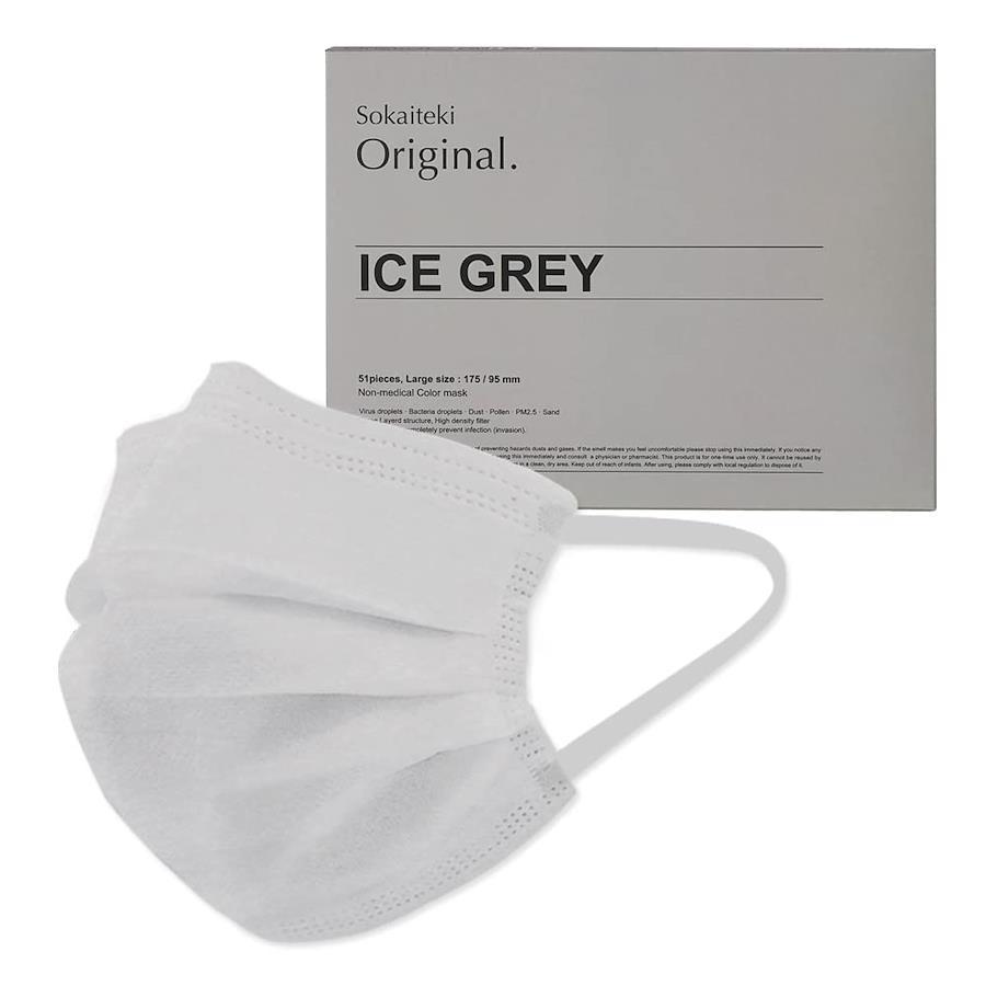 ★日本企画で日本機構検証済★爽快適(SOKAITEKI)シリーズのマスクは全て日本企画で日本機構検証済の不織布マスクです。★商品情報★【入り数】51枚入り【サイズ】17.5×9.5cm(成人レギュラーサイズ)【カラー】アイスグレー【タイプ】使い捨て不織布マスク★快適のデザイン★とろける、やわらかい幅広ゴムを採用。耳の痛みを気にせず、快適にお過ごしいただけます。耳に負担が少ないとても柔らかな5.5mmの平ゴムを採用。一度使えばほかのマスクをつけるのが嫌になる付け心地を体験して下さい。ゴム紐の接着面が肌に当たるとチクチクしたり、かゆくなったりと敏感肌の方も安心して使って頂けるよう、接着面を外側にしました。また、接着面を外にすることで、頬とマスクの隙間がなくなり、よりフィット感が増します。★三層構造&安全★呼吸がラクなのに、3層構造BFE・PFE99%以上カットするフィルターを採用。飛沫防止、花粉対策、ダスト、ほこりなど対応頂けます。通勤や通学、外出時や室内などご使用いただけます。★有毒物質ゼロ★肌に優しい中性生地、特定芳香族アミンの検査で有毒物質の検出のゼロ。安全安心をお約束。