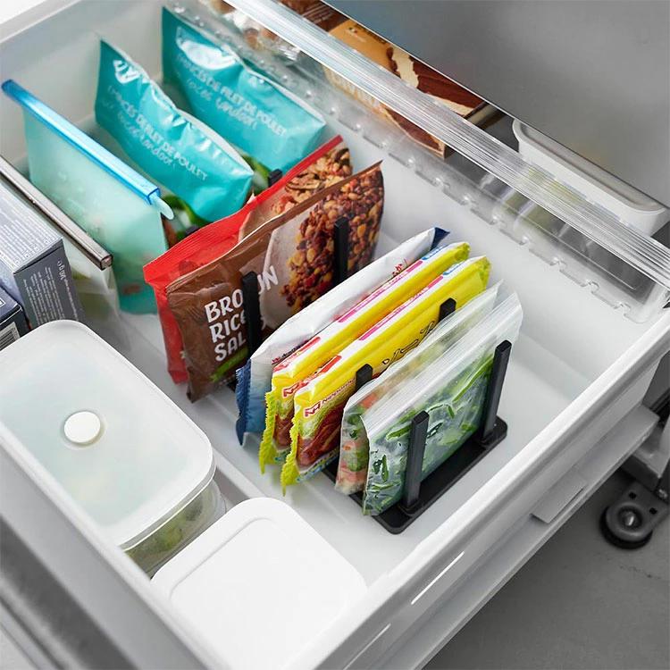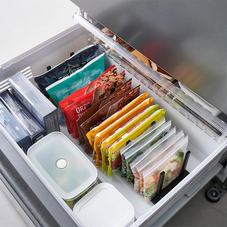 【冷蔵庫中仕切り調節収納スタンド W27】冷凍庫の食品を立てて整理できる冷凍庫中収納スタンドです。仕切りバーは収納物のサイズに合わせて調節が可能で、本体裏面には引き出しの開閉時にずれにくい滑り止め付き。スッキリと綺麗に整理できるのでセカンド冷凍庫への使用にもおすすめです。
