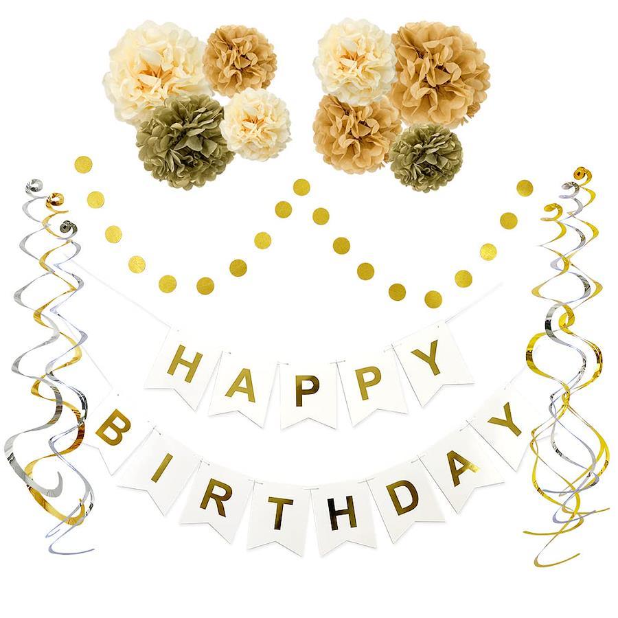 【スワールパーティーセット】揺れるうずまきがキラキラ可愛いお誕生日の飾り付けセット。これひとつで華やかなパーティー空間が作れるバースデーデコレーションです。別売りの数字バルーンと組み合わせても華やかになります。 【ナチュラルなミルキーゴールド】シンプルに飾りたい方は一番人気のミルキーゴールドがおすすめ。落ち着いた雰囲気で記念撮影できます。 【個性豊かな全部で6カラー】女の子にも男の子にも★飾り付けたい雰囲気に合わせてお好きなカラーをお選びください。 【セット内容】ペーパーフラワー…6個、HAPPY BIRTHDAYフラッグレターバナー…1点、シェイプガーランド…1点、スワール(うずまき)…6本