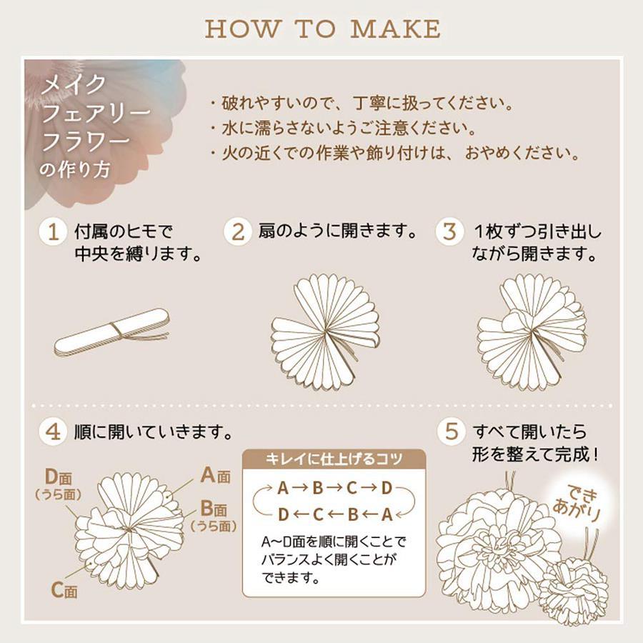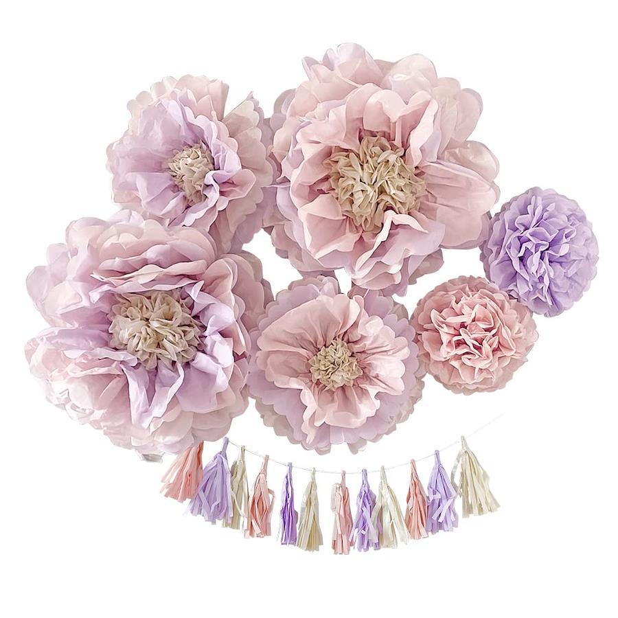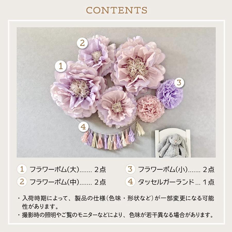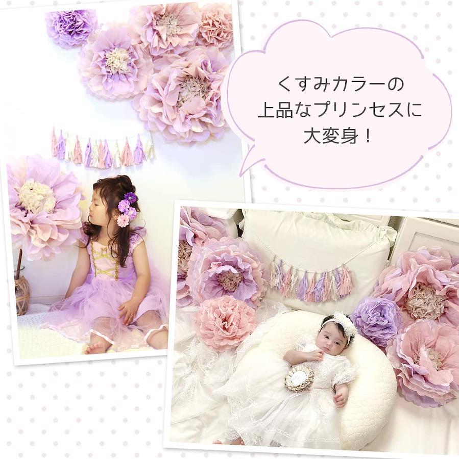 【メイクフェアリーフラワーセット】くすみピンクと紫のお花のペーパーファンがかわいい!ハーフバースデー、100日祝い、お誕生日にぴったりな飾り付けセット。存在感のある大中小6個のお花と同系色のタッセルガーランドが入ったバースデーデコレーション。【新色ブルーム登場】お誕生日や記念日に!大人っぽいくすみのプリンセスカラー!ナチュラルな飾り付けをしたい方におすすめ!ホワイト数字バルーンやシンプルなタペストリーと合わせて飾ってもかわいいですよ。【セット内容】フラワーポム(大):2点(直径 約45cm)フラワーポム(中):2点(直径約30cm)、フラワーポム(小):2点(直径 約20cm)、タッセルガーランド:1点(幅 約60~70cm、高さ 約12cm、ひも長さ 約290cm)【作り方】大きなジャイアントフラワーがアクセント。大切なハーフバースデー、100日祝い、お誕生日など記念日やイベントを華やかに盛り上げてくれます。園芸用の支柱で、茎付きフラワーのアレンジもできます。作り方は、じゃばらに折りたたまれた薄紙を一枚ずつ開いていくと、美しいジャイアントフラワーのできあがり。【免責事項】メーカーによる商品リニューアルに伴いパッケージ(内容量も含む)変更が行われた場合、新パッケージでお届け致します事ご了承願います。