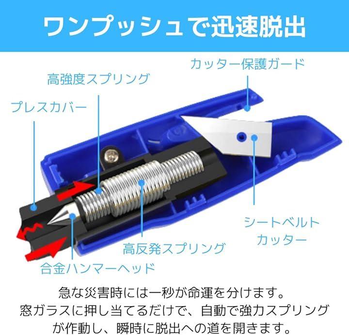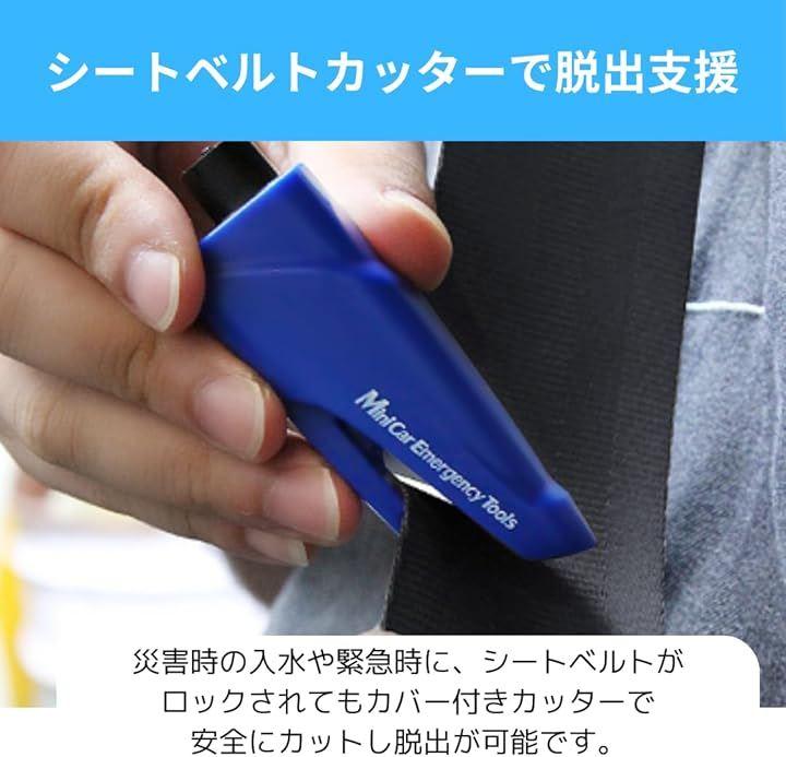 「シートベルトカッターで脱出支援」災害時の入水や緊急時に、シートベルトがロックされてもカバー付きカッターで安全にカットし脱出が可能です。