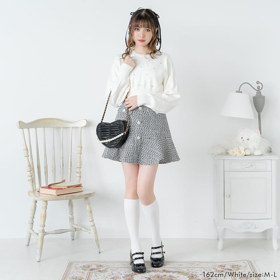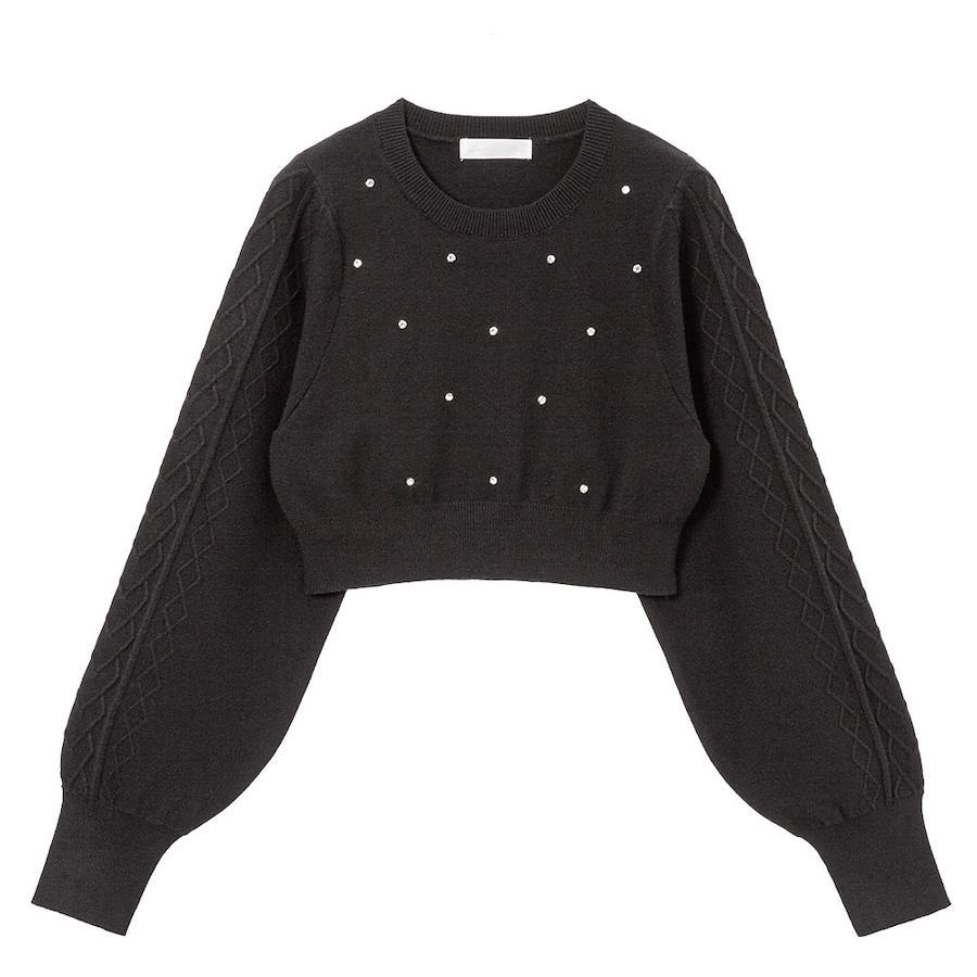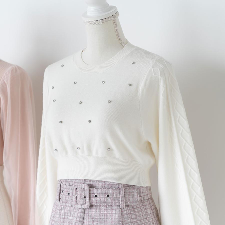 今季大注目のラインストーン付きショート丈ニットトップスのご紹介。【デザイン】きらきらのラインストーンが散りばめられたショートニットトップスです。小さなビジューとコンパクトな丈感がトレンドライクで、着るだけで旬なコーデが完成するアイテム。ぽわっとボリューミーなあざと可愛いお袖にはハートケーブルが施されていて、ガーリーさも忘れない他と差がつくデザインに♪襟元リブはしっかりと伸びるので、被りで楽に着用いただけます。裾リブも少し長めで、ボトムにinしなくてもスタイルUPできちゃうシルエットもポイントです◎1枚でも重ね着でも多様な着方が出来ちゃう着回し抜群なニットです♪