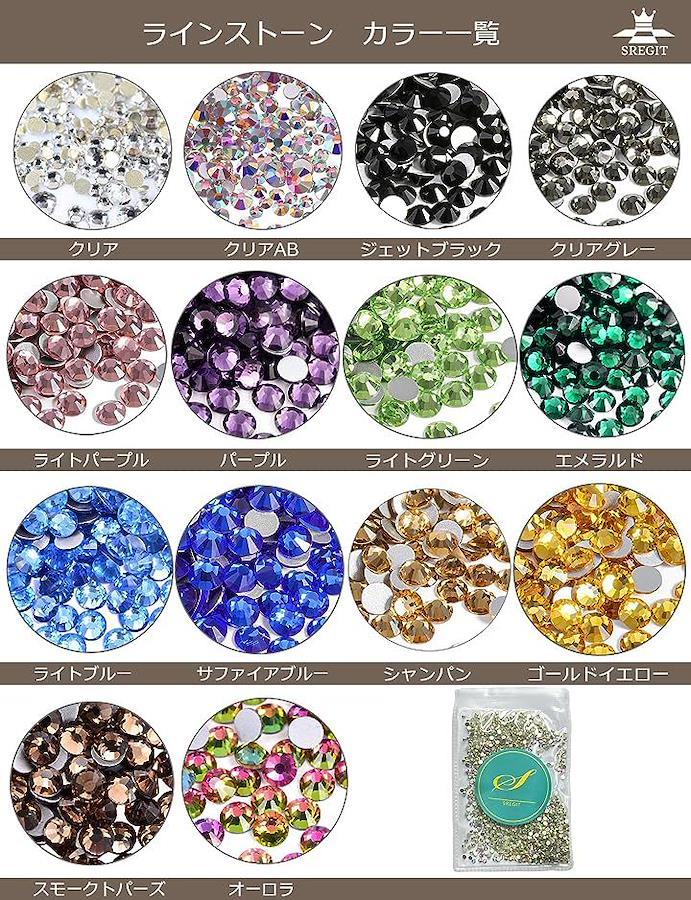 「内容量」:ラインストーン/1カラー・1サイズ(計1300粒以上)「カラー」 クリア / クリアAB / ジェットブラック / クリアグレー / ライトパープル / パープル / ライトグリーン / エメラルド / ライトブルー / サファイアブルー / シャンパン / ゴールドイエロー / スモークトパーズ / オーロラ
