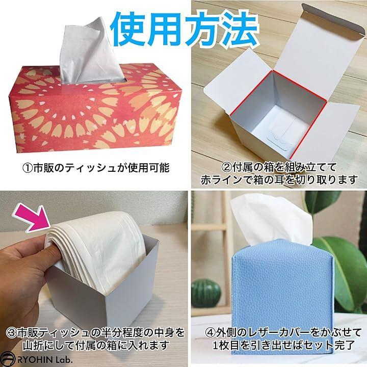 「使用方法」市販のティッシュの中身を山折にして、 付属の箱素材:厚紙に入れます。