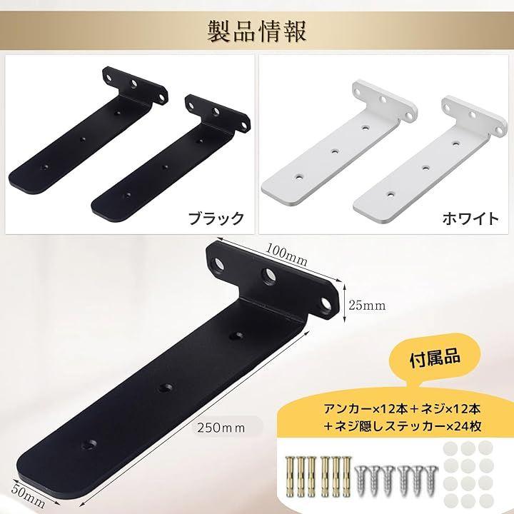 「商品仕様」セット内容:ブラケット本体x4本 ボードアンカーx12本 ネジx12本 ネジ穴ステッカーx24枚、 ブラケット本体サイズ:長さ25cmx幅10cmx高さ2.5cm