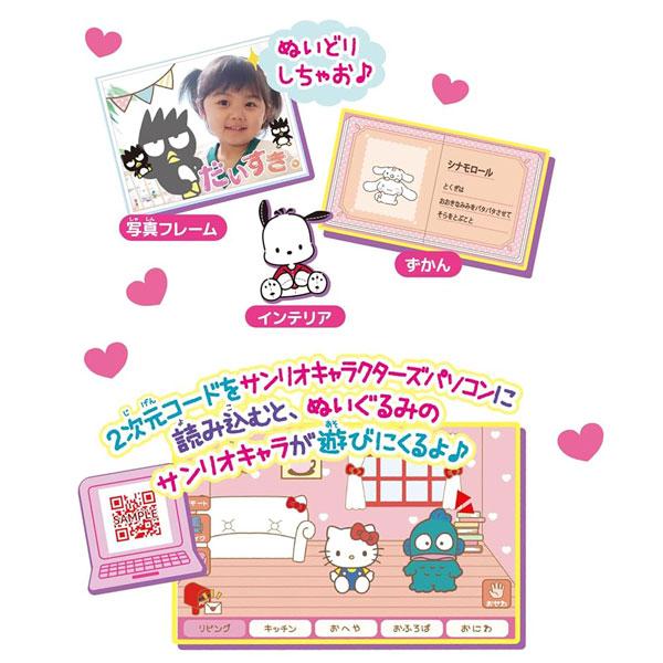 ぬいぐるみ達が持っている二次元コードを「サンリオキャラクターズパソコン」のカメラで読み取ると、ぬいぐるみのキャラクターとお友だちがパソコンの画面に登場し、一緒に遊ぶことができます。