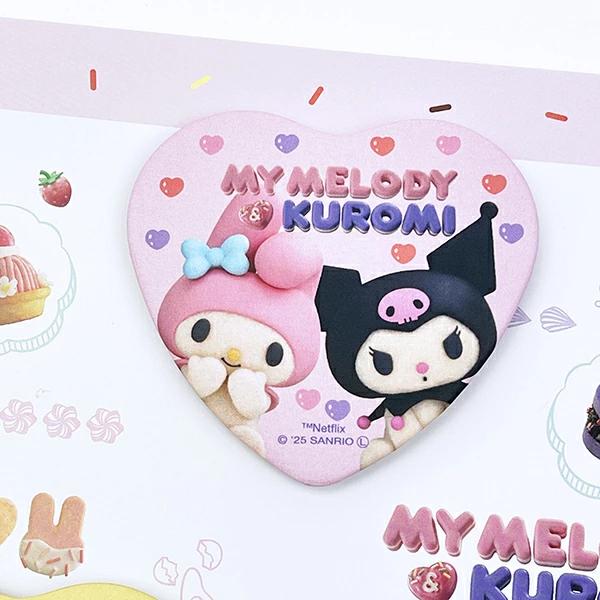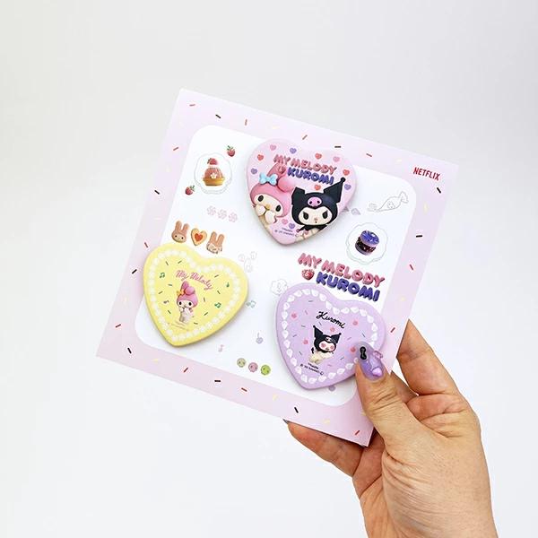 Netflixオリジナルアニメ「My Melody&Kuromi」デザインシリーズのハート型缶バッジ3個セットです。いつもと違うマイメロディ&クロミが楽しめちゃいます♪ハート型がとってもキュートなのでバッグなどに付ければ可愛さもMAX☆今話題のアニメシリーズなのでぜひ記念にいかがですか?
