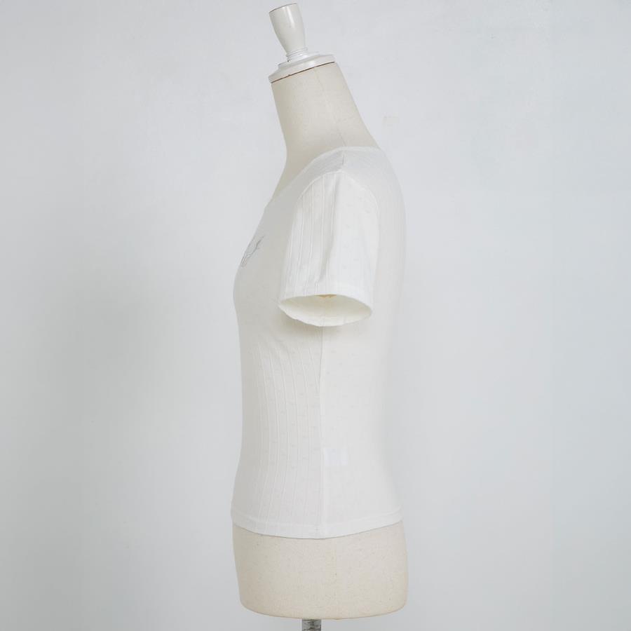 ◆Designリボンのディテールが加わることで、さらにキュートでロマンティックな印象を与えます。素材にまでさりげないハート柄でリブカットソーになっています。