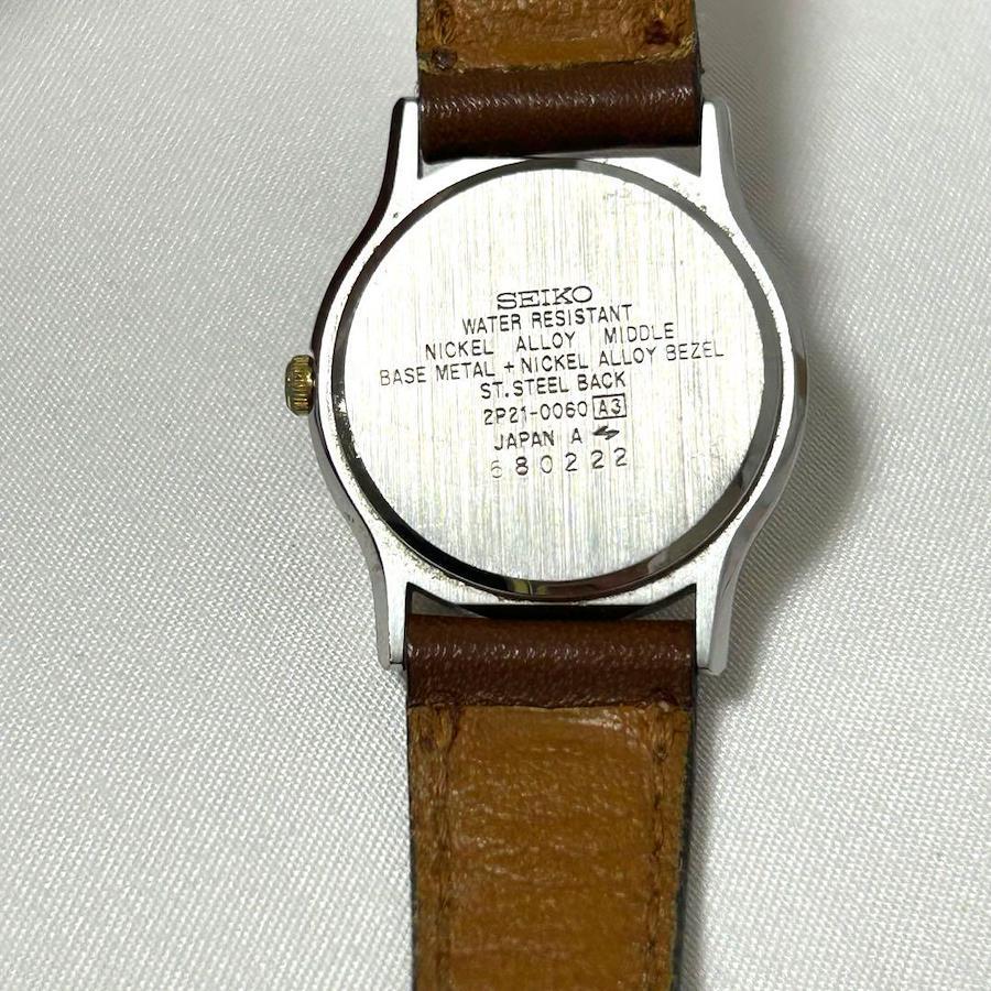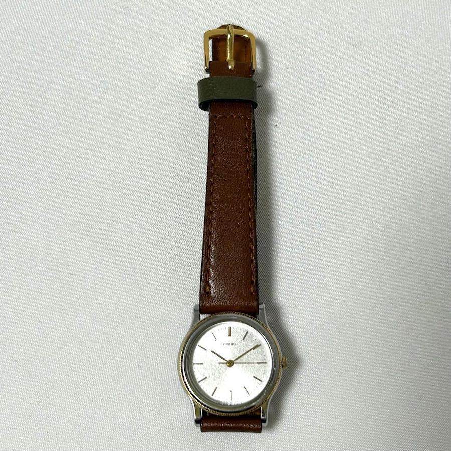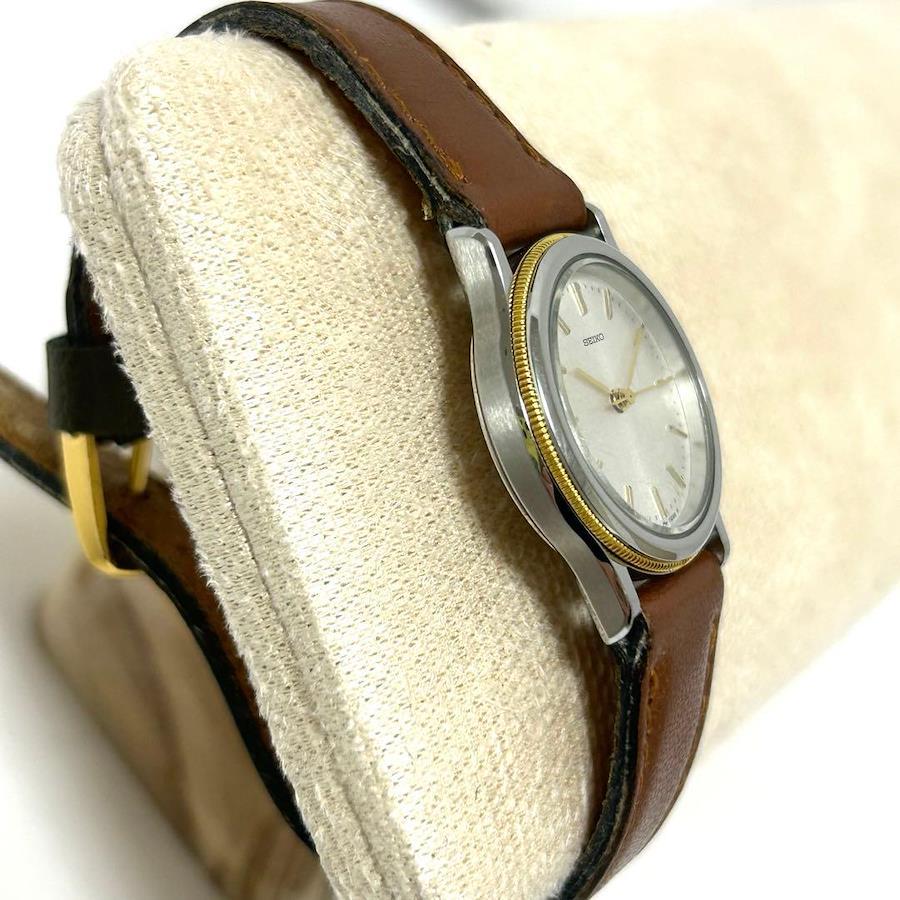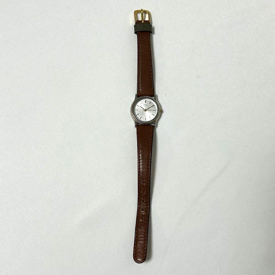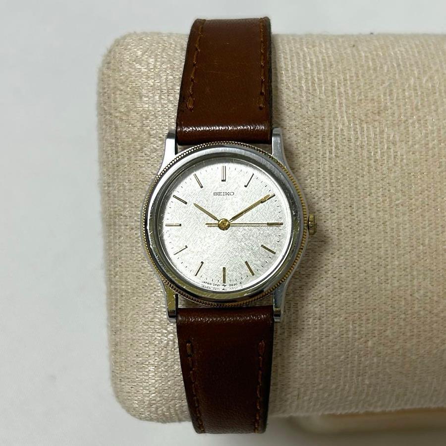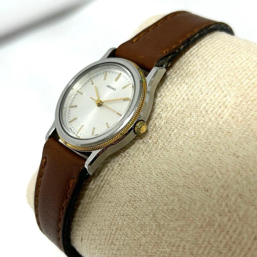 こちらは SEIKO セイコー ヴィンテージ クォーツ 腕時計 レディース ツートンカラーになります。シルバーの文字盤とブラウンレザーのバンドが特徴のセイコーのアナログクォーツ腕時計。