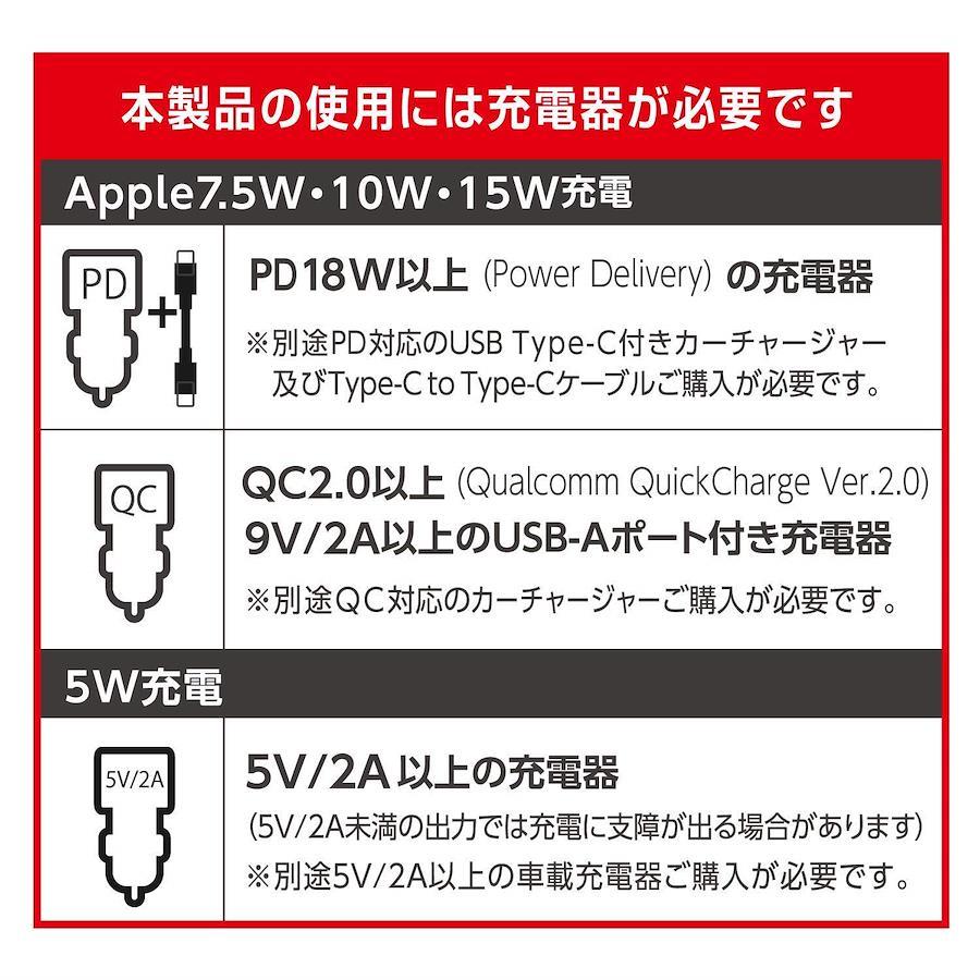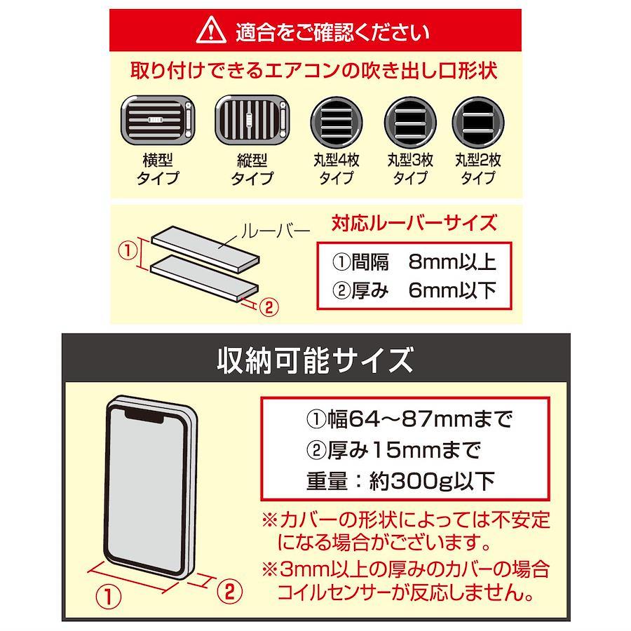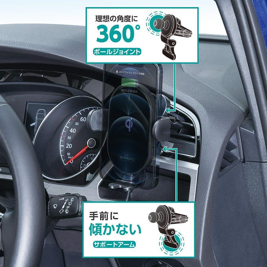 50年以上も国内カー用品市場で実績を積んできた大手カー用品メーカー「セイワ(SEIWA)」から登場。●自動て?アームか?可動し、Qi正規認証ワイヤレス充電機能内蔵の車載携帯電話 ホルタ?ーて?す。●エアコンルーハ?ー取り付けタイフ?て?す。●ワイヤレス充電対応の携帯電話は充電ケーフ?ルに接続する必要か?なく、本製品にセットすることにより充電か?始まります。●本製品と携帯電話の間に金属か?挟まれたり、一定以上の温度になった場合、異物・過熱検知機能により自動的に充電を停止する安全回路内蔵て?す。●最大出力15Wて?効率的に充電します。●携帯電話をかさ?すとコイルセンサーか?反応してアームか?閉まるのて?、誤作動か?少ないて?す。●ケースや手帳型カハ?ーを装着したままて?の取り付けも可能て?す。●エアコンクリッフ?はホ?ールシ?ョイントて?角度調節か?可能て?す。タテ・ヨコ回転、左右に角度調節て?きます。●両サイト?にあるリリースホ?タンを押すとアームか?開きます。エンシ?ンを切ってから約30分以内は内蔵電源によって、アームの開閉か?1回可能て?す。