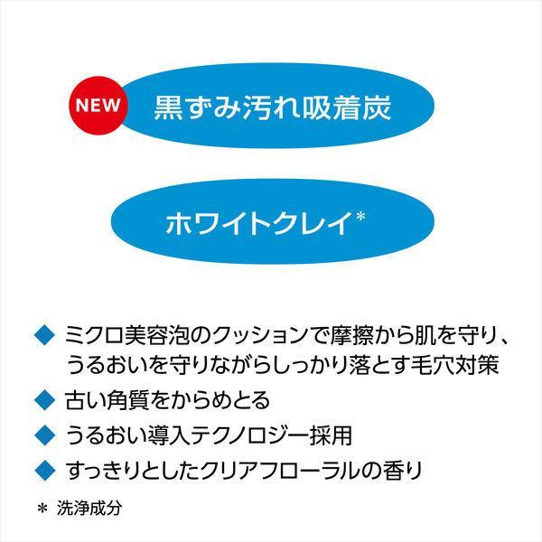 毛穴のがんこな黒ずみ悩みに!黒ずみ・角栓まで吸着洗浄洗い上がりすっきり、毛穴もキュッ。つるつるで、透明感のあるまっさらすっぴんへ●ミクロ美容泡のクッションで摩擦から肌を守り、うるおいを守りながらしっかり落とす毛穴対策。●ダブルの洗浄成分配合(黒ずみ汚れ吸着炭、ホワイトクレイ)で、毛穴のがんこな黒ずみ悩みに対応。●古い角質をからめとる。●うるおい導入テクノロジー採用。●自然由来シルクエッセンス(セリシン、グリセリン(保湿))。●Wヒアルロン酸(アセチルヒアルロン酸Na、ヒアルロン酸Na(保湿))。●すっきりとしたクリアフローラルの香り。