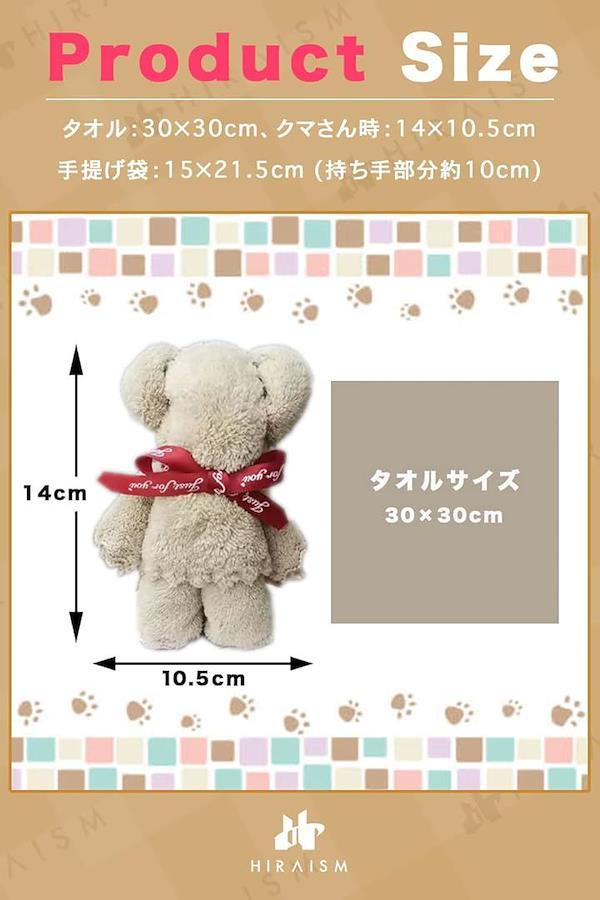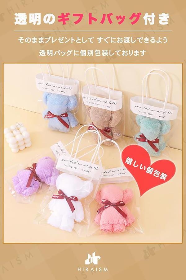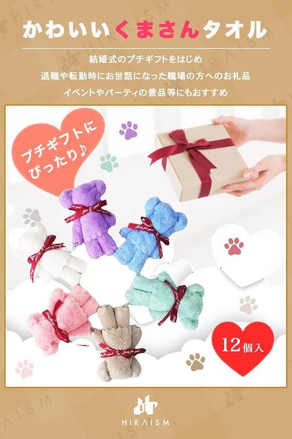 「商品内容」プチギフト ベアタオル:12個 カラー:ホワイト、ブラウン、ブルー、ピンク、グリーン、パープル(各色2個ずつ) <サイズ> タオル:30x30cm、クマさん時:14x10.5cm、手提げ袋:15x21.5cm (持ち手部分約10cm)