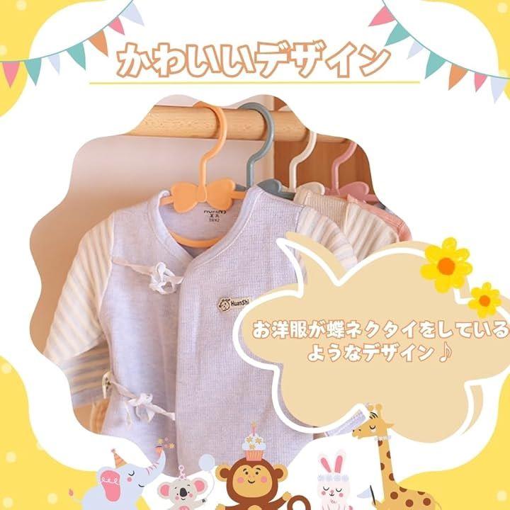 「かわいいデザイン」このベビーハンガーに服を掛けると、お洋服が蝶ネクタイをしているような可愛らしい見た目になり、ベビールームを華やかに彩ってくれます。