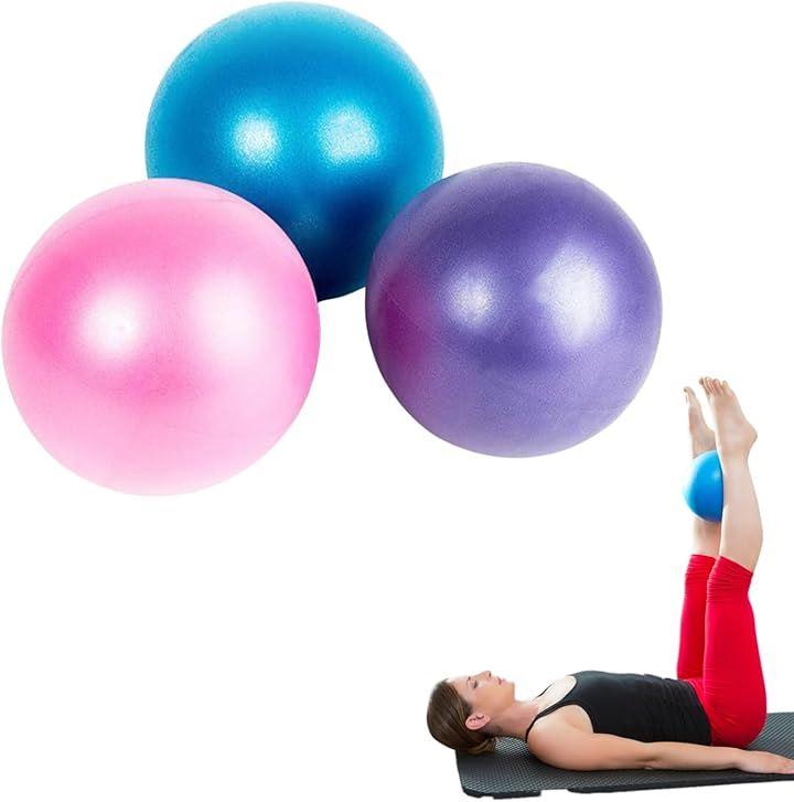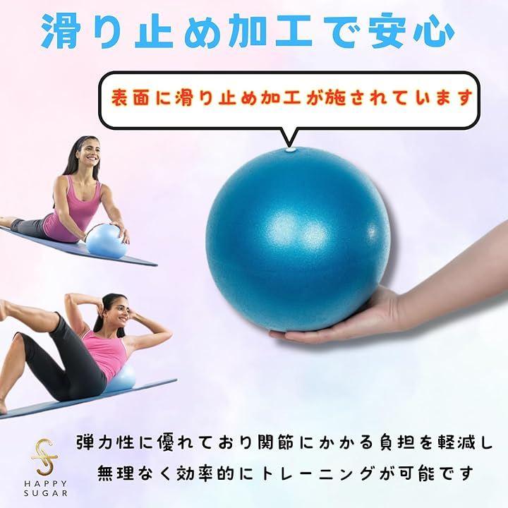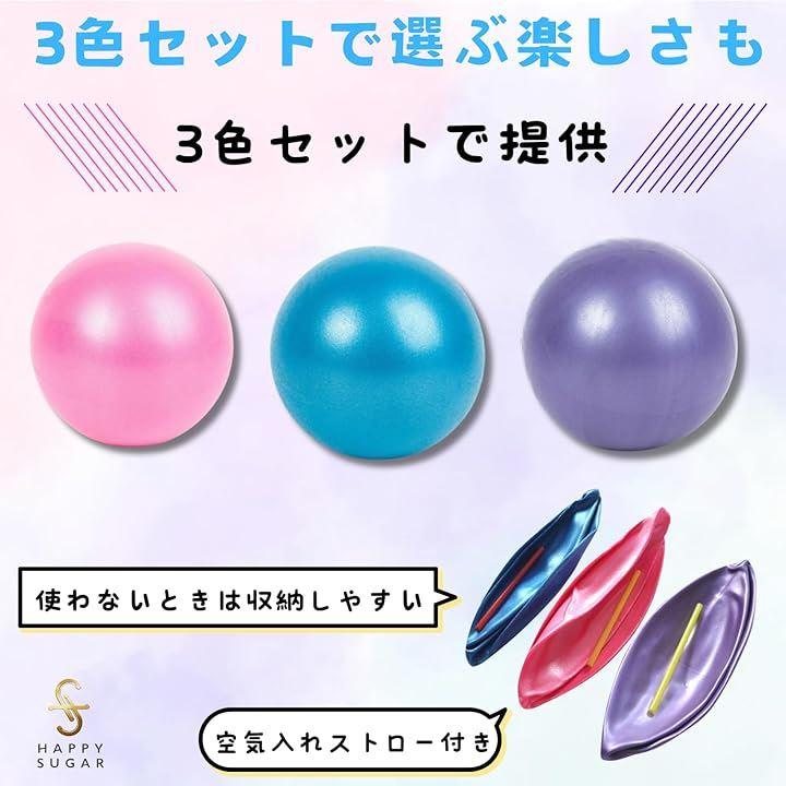 「商品詳細」ヨガボール ミニ:3個 カラー:ピンク, ブルー, パープル(各色1個ずつ) サイズ:20cm-25cm 重量:100g / 個 材質:PVC 最大耐荷重:約85kg 付属:空気入れ用ストロー