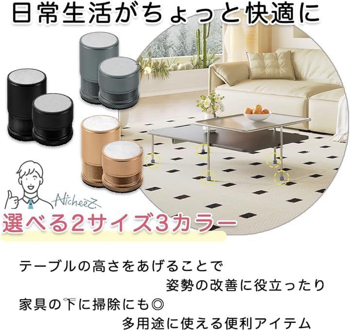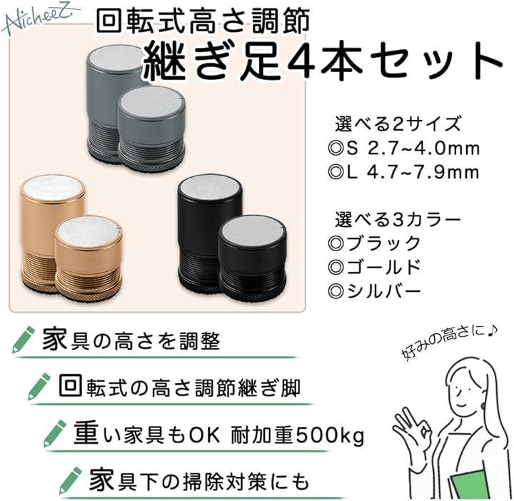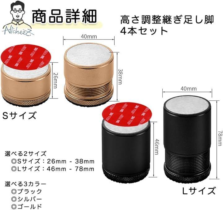 「商品内容」アルミ合金製継ぎ脚(4個セット) カラー:ブラック/シルバー/ゴールド サイズ:直径4cm (大)高さ4.6cm~7.8cm (小)高さ2.6cm~3.8cm