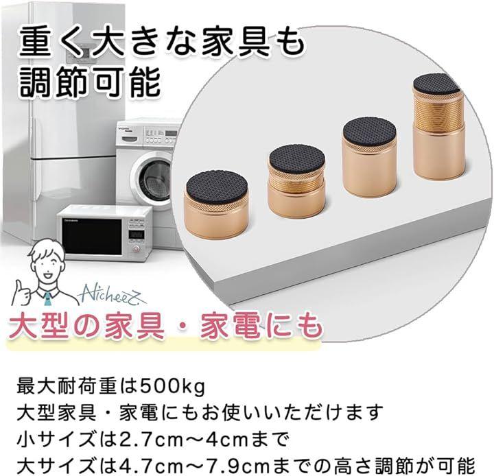 「重く大きな家具も調節可能」最大耐荷重は500kgなのでソファやTVボード・洗濯機などの大型家具・家電にもお使いいただけます。