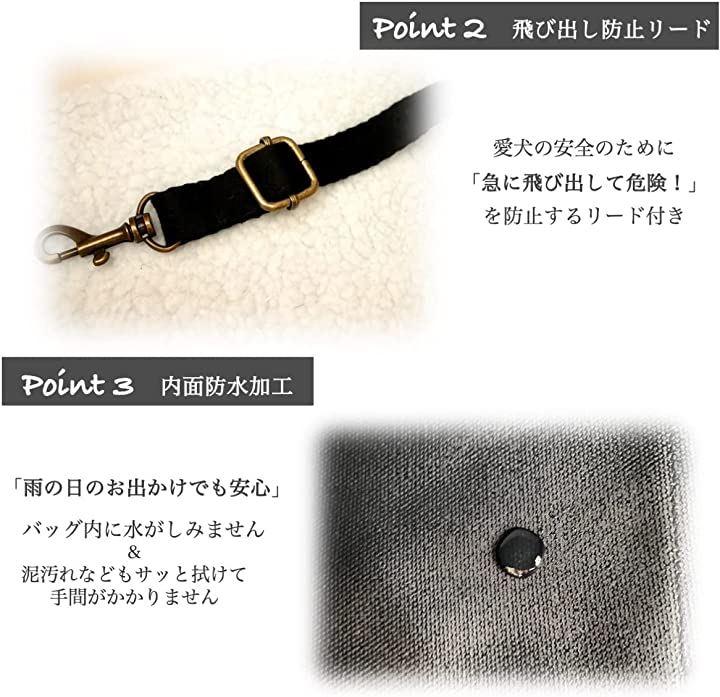愛犬が飛び出すのを防ぐ飛び出し防止リードの他、雨天でのお出かけでも中に水がしみることがないよう、バッグの内側は防水加工されています。