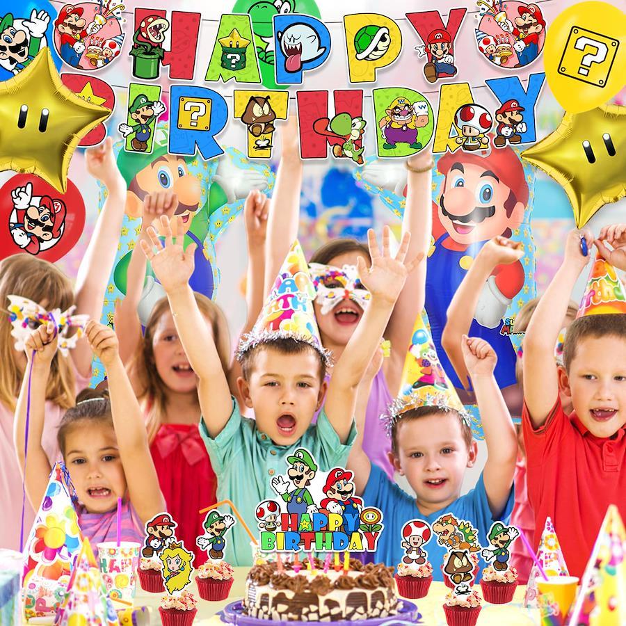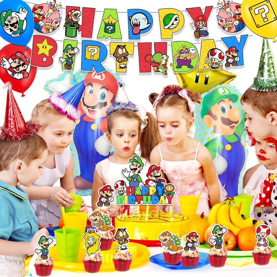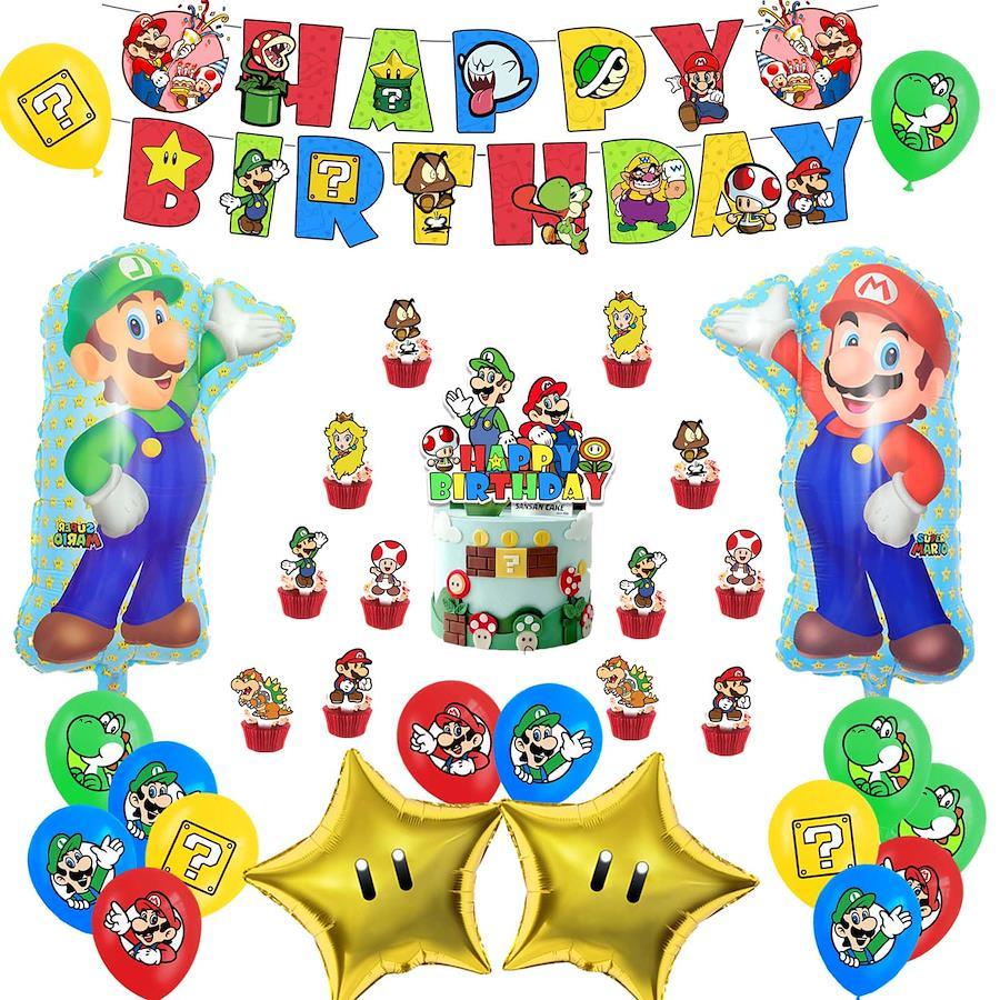 【バースデー飾り付けセット】①HAPPY BIRTHDAYバナーx1、②ケーキトッパー(大きめ)x1、③ケーキトッパー(小さめ)x12、④バルーンx20、⑤マリオアルミバルーンx2、⑥スターアルミバルーンx2