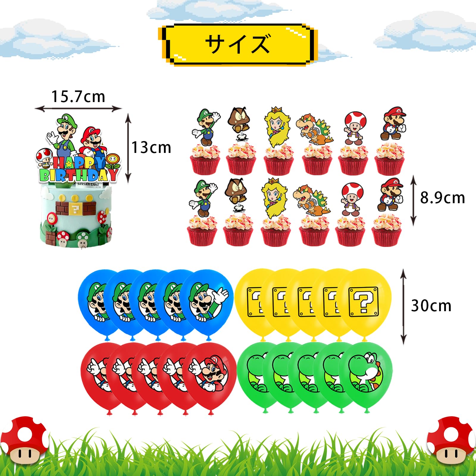 【バースデー飾り付けセット】①HAPPY BIRTHDAYバナーx1、②ケーキトッパー(大きめ)x1、③ケーキトッパー(小さめ)x12、④バルーンx20、⑤マリオアルミバルーンx2、⑥スターアルミバルーンx2【素材】風船セットは、無毒で無害、安全で環境に優しく、耐久性の高品質ある天然ラテックスで作られています。 画像は高精細カラー印刷で、キュートでファッショナブルです。これをあなたの家族や友人にとって忘れられない瞬間にするのを手伝ってください。可愛いバルーンがあり、お宅をもっと綺麗に飾り、その以外、パーティーの後に子供の部屋を持続に装飾できます。【HAPPY BIRTHDAYバナー】Happy Birthday バナーは高品質の紙で作られて、体に無害で、環境に優しいですね。色付きのバナー文字をリボンで結びますとバースデーバナー。間隔を調整し、好きなだけ長く保ちます。【適用場合】誕生日会だけでなく、サプライズパーティー、子ども会、子供の日、一歳二歳三歳の祝日祭り、体育祭、文化祭、保育園、幼稚園、ゲームセンター、主題店舗、部屋装飾にも適用します。どこでも飾り付けられ、簡単に雰囲気を盛り上げます。【免責事項】メーカーによる商品リニューアルに伴いパッケージ(内容量も含む)変更が行われた場合、新パッケージでお届け致します事ご了承願います。