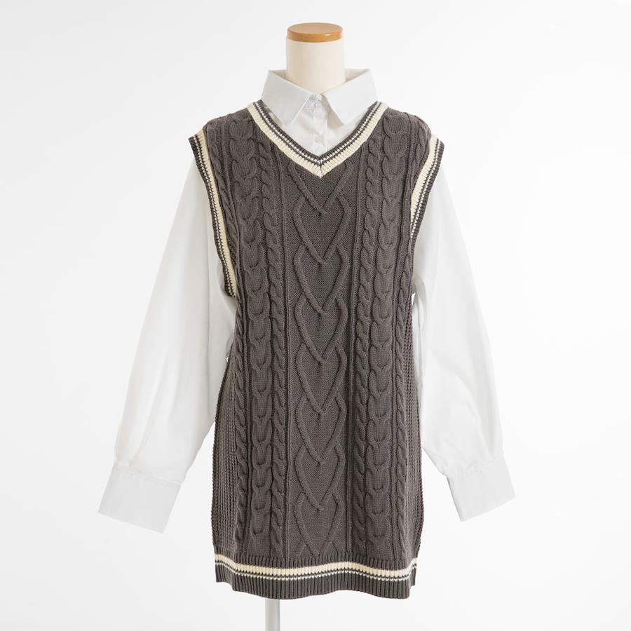シャツとニットベストワンピのドッキングデザインワンピースのご紹介。【デザイン】トレンド感のあるプレッピーなデザインが可愛いレイヤード風ワンピース。ニット部分の立体的なハートケーブルがきゅんっとするデザインです♪袖はボリュームスリーブでゆるっとしたシルエットながら、ニット部分はIラインシルエットでスタイルアップしてくれます。シャツ襟の前立て釦を開けて、被りで着脱する仕様です。