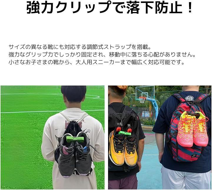 「スマートに靴を持ち運べる。シューズクリップ登場」 スニーカーや通勤・通学用のシューズ、運動靴などを手軽かつスタイリッシュに持ち運べる便利アイテム。