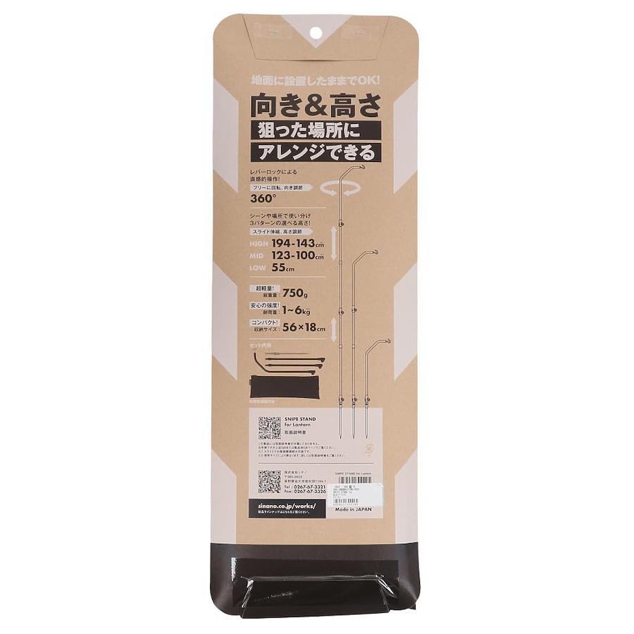 無段階の高さ調節機構で、使用場所に合わせた高さに設置可能なランタンスタンド。 高さ変更はレバーロックだから設営後の方向と高さの変更も思いのまま。 地面に素早く食い込む、立体的な形状を持たせたスリムな専用ペグがついています。 シャフト素材:耐食アルミ合金φ16mm/14mm 使用サイズ:高さ194~143cm 本体重量:750g 収納時サイズ:約18×56×3cm 耐荷重:1~6kg ※使用する高さ、設置環境、ギア形状の影響を受けます。必ず垂直に設置し、かけるギアの重量をよくご確認の上ご使用ください。 素材:シャフト/アルミ(Black アルマイト加工)、ペグ/ステンレス 付属品:専用収納袋 生産国:日本ランタンスタンドシナノワークス