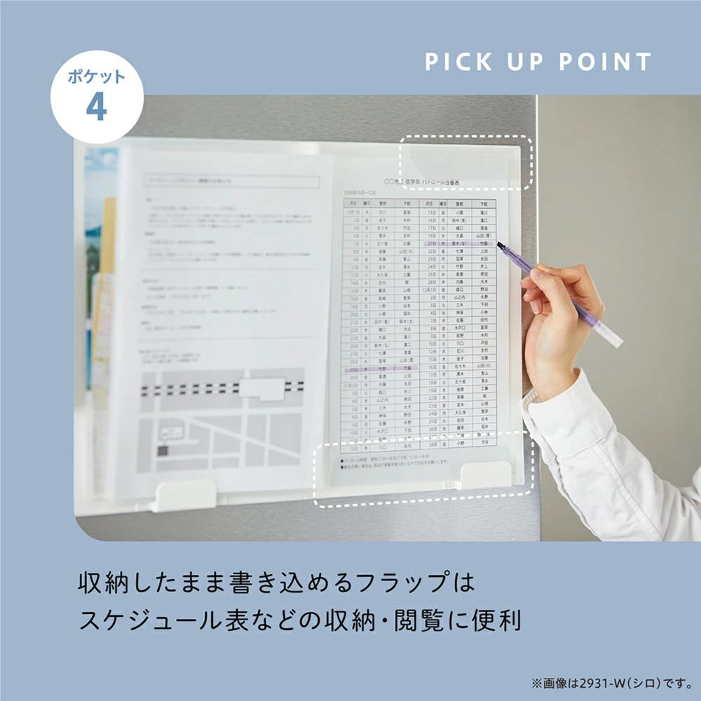 【商品情報】●冷蔵庫のドアをスッキリ整理!●冷蔵庫につい貼りがちなプリントやおたよりなど、異なるサイズの書類をひとめとめに収納●インテリアになじむスタイリッシュなデザインで生活感をリセットします●ペンを1本はさめるボックス●上からサクッと出し入れしいやすい大容量ポケット●小さい紙類も取り出しやすい浅めのポケット●バラバラとめくって閲覧できるヨコ入れポケット(4枚/8ページ)●裏表紙の内側にA4書類を1枚はさめるフラップ付き