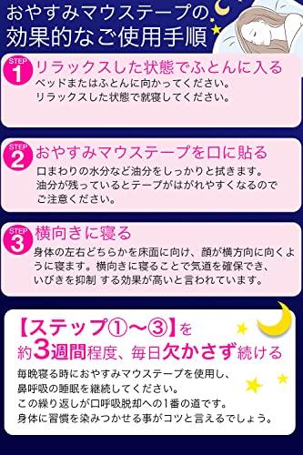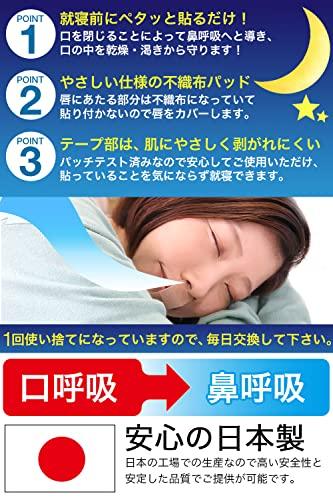 【睡眠中の鼻呼吸をサポート】寝る前に口に貼るだけで鼻呼吸をサポート 鼻呼吸習慣を作る】口呼吸がいびき・のどの乾きの原因!口を閉じることにより『鼻呼吸』をサポートします。 いびき・のどの渇き・雑菌の侵入の要因となる口呼吸を抑制し鼻呼吸を促します。 口閉じテープ 日本製