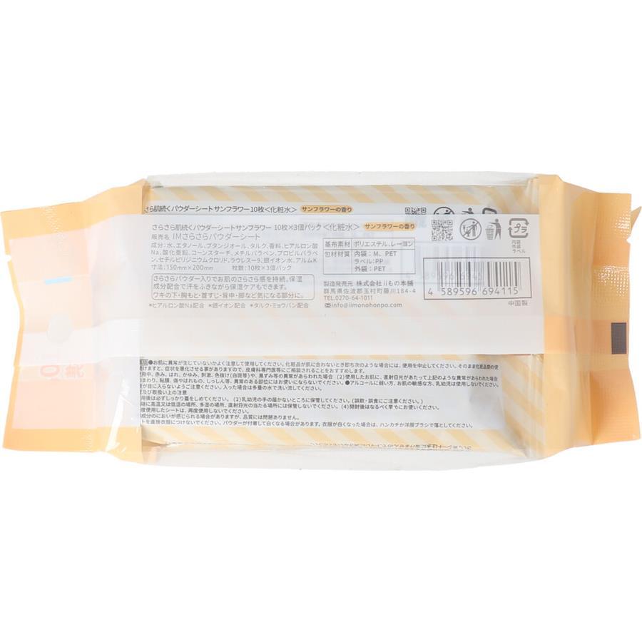汗のベタつき、ニオイすっきり!ふんわりやさしいサンフラワーの香り。●さらさらパウダー入りでお肌のさらさら感を持続します。●保湿成分配合で汗をふきながら保湿ケアもできます。●ヒアルロン酸Na配合、銀イオン配合。●スポーツ後に。お出かけの時に。●携帯に便利な10枚X3個パック入。