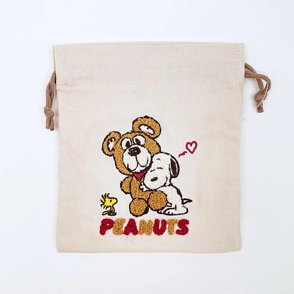 スヌーピーの巾着です♪ベアをハグしているスヌーピーがとってもキュート♪サガラ刺しゅうのデザインも◎ナチュラルカラーで飽きがこないデザイン♪小物入れにとっても便利☆彡