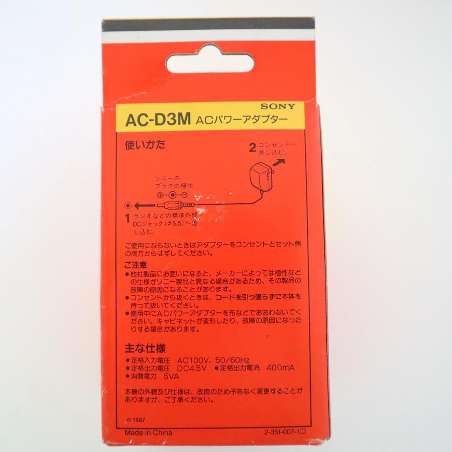 【詳細】■ 商品名・モデル:ACパワーアダプター AC-D3M■ ブランド:SONY(ソニー)■ カラー:グレー■ 状態:- 傷・汚れ:本体に目立つ汚れ・ひび割れ・黄ばみなし。外箱にスレあり。説明書にシミあり。- 使用感:リユース品のため、購入時期や使用回数は不明です。- 動作確認:環境がなく未確認のため現状品扱いとなります。■ 付属品:元箱/説明書/内トレー/ビニール袋■ セット内容:- AC-D3M 本体