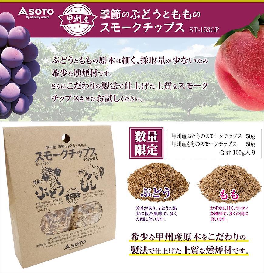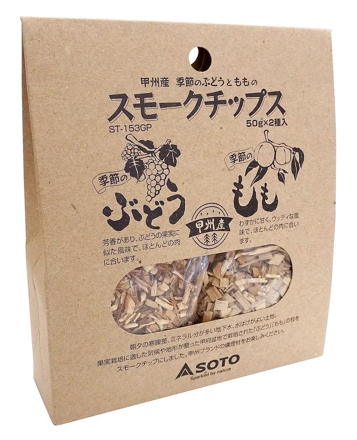 ●甲州産のぶどうともものスモークチップス。●希少な甲州産原木をこだわりの製法で仕上げた上質な燻煙材。●ぶどう:芳香があり、ぶどうの果実に似た風味。肉におすすめ。●もも:わずかに甘く、ウッディな風味。肉におすすめ。●各50g入り。