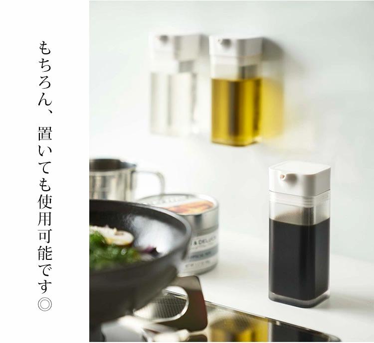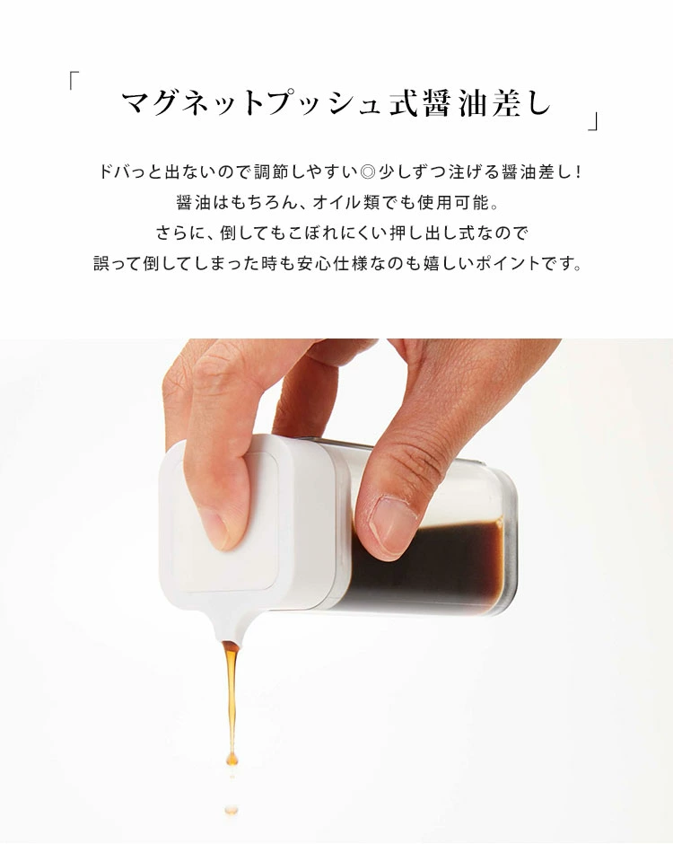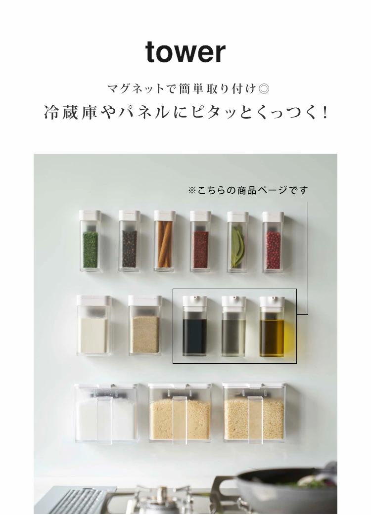 【マグネットプッシュ式醤油差し】丁寧な暮らしをするおしゃれさんたちにお届けする、シンプルながらもアイデアのつまったtowerのキッチンシリーズ。ドバっと出ないので量を調節しやすい◎少しずつ注げるプッシュ式醤油差し!醤油はもちろん、オイル類でも使用可能。背面にマグネットがついているので冷蔵庫やマグネットが対応している場所に取り付けられます。