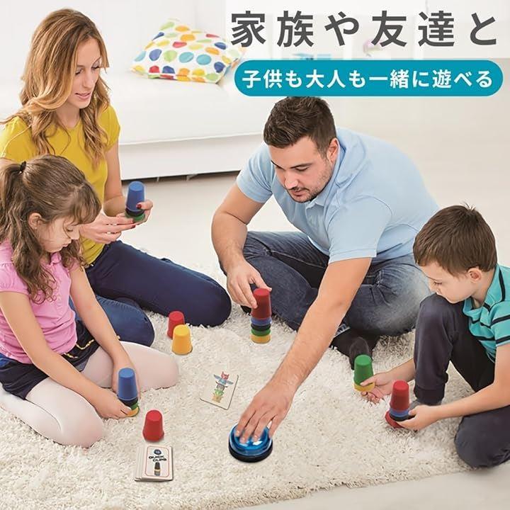 「瞬発で勝負」カードの配列や色を素早く読み取り、5色カップを並べてベルを鳴らすだけ。