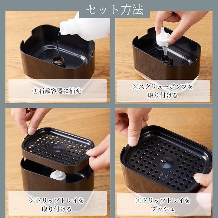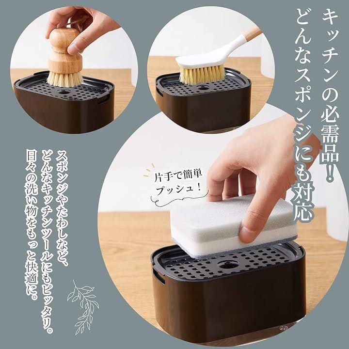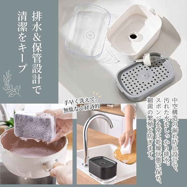 「2 in 1設計でシンク周りスッキリ」 石鹸ディスペンサーとスポンジホルダーが一体化し、キッチンの省スペース化を実現。