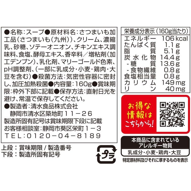 さつまいも加工品(さつまいも(九州))、クリーム、濃縮乳、砂糖、ソテーオニオン、チキンエキス調味料、食塩、酵母エキス、香辛料/増粘剤(加工デンプン)、乳化剤、マリーゴールド色素、pH調整剤、(一部に乳成分・小麦・鶏肉・大豆を含む)