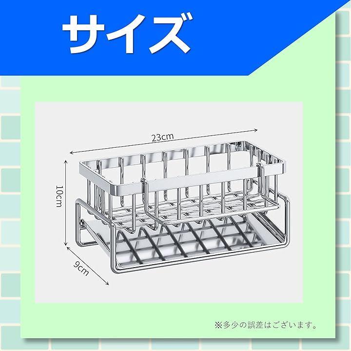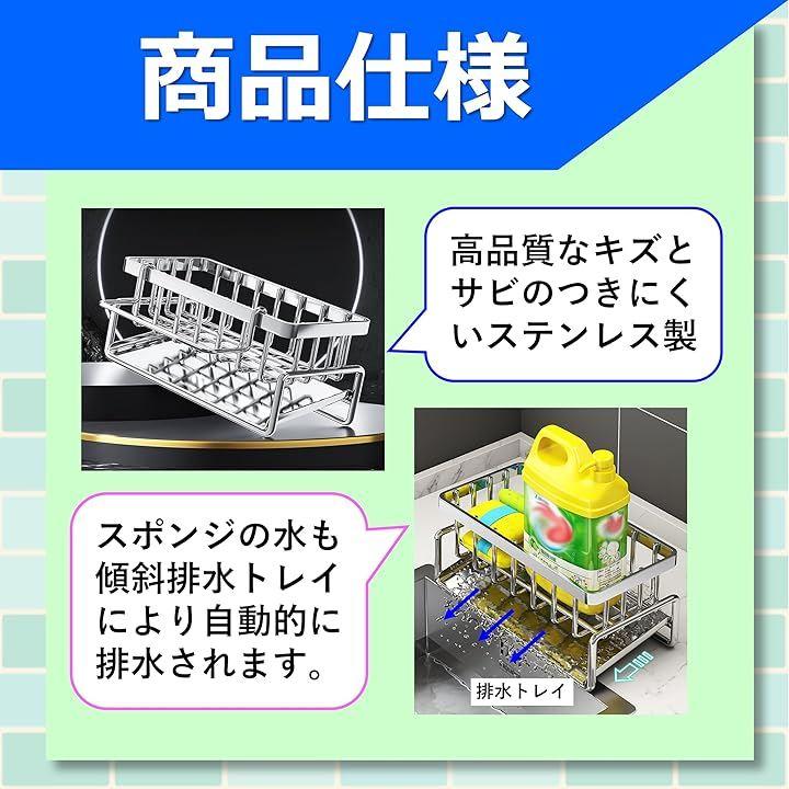 「防錆&頑丈。ステンレス製スポンジホルダー」 このステンレス製スポンジホルダーは、キッチンや洗面所でのスポンジや洗剤の整理に最適なアイテムです。