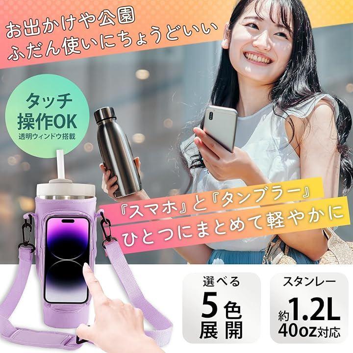 「商品詳細」*カバーサイズ:高さ 24cm、上部直径 10cm、下部直径 7cm / *ショルダーベルト:55cm~108cm(調整可能) / *タッチウィンドウ:約16cmx7.5cm / *カラー:5種類 / *スタンレー対応容量:約1.2L(40oz)