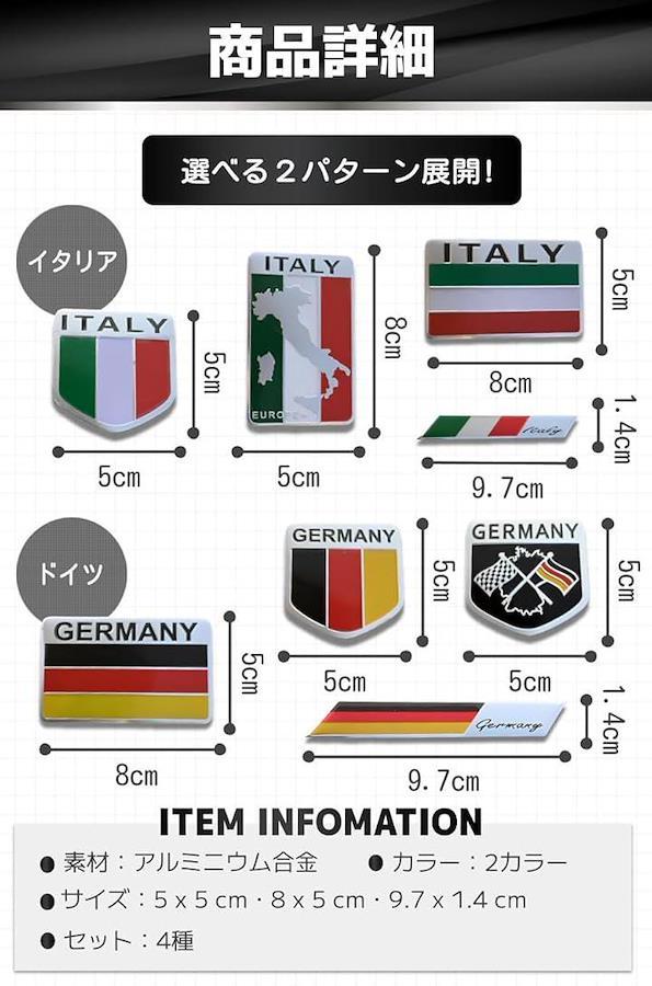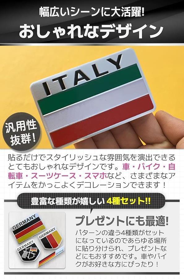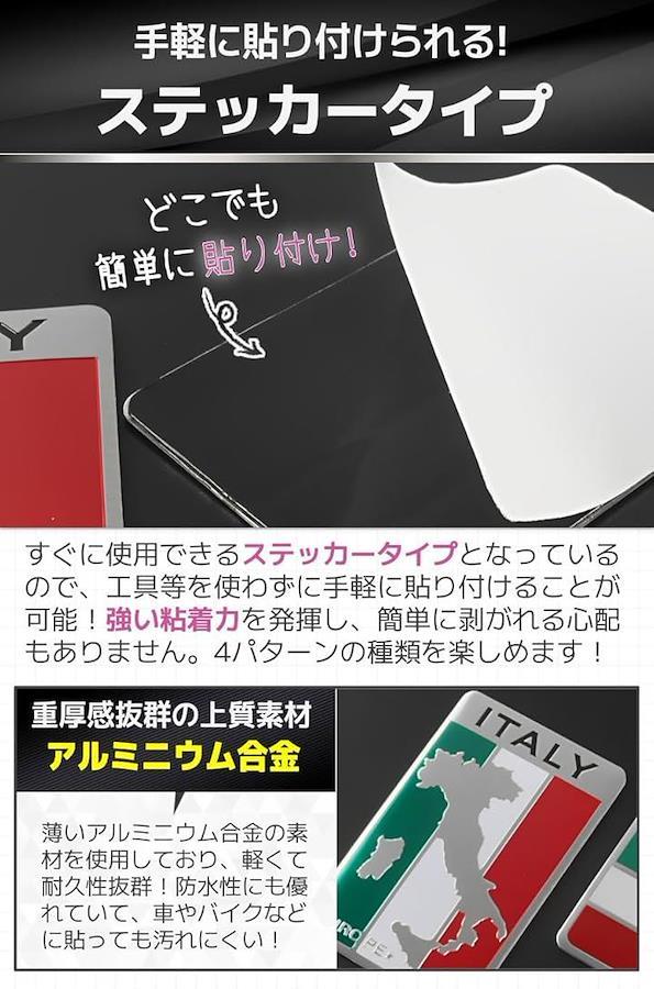 「商品特徴」(1)嬉しい高耐久素材:重厚感や耐久性抜群のアルミニウム合金/(2)防水で屋外使用にも.:天候を気にせず車やバイクに貼れる。/(3)さまざまな用途に:愛車以外にスーツケースやスマホにも/(4)貼り分けや予備用に:色々なパターンが楽しめる4種セット