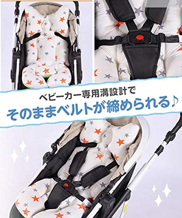 ・首クッションとベビーカーシートの一体型 、ベビーカーから外さずに安全ベルトを装着できます。