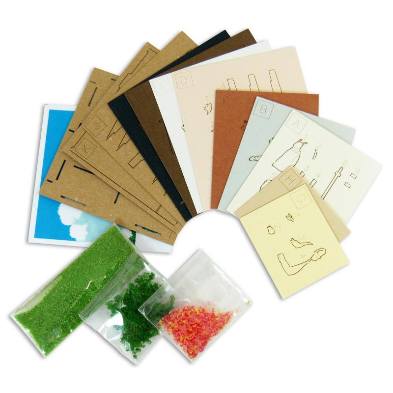 ■セット内容:レーザーシートA〜K(11枚)、ベース(1枚)、印刷シート(1枚)、スポンジ、パウダー、色砂、組立て説明書