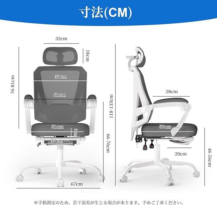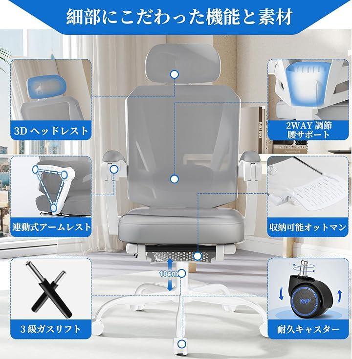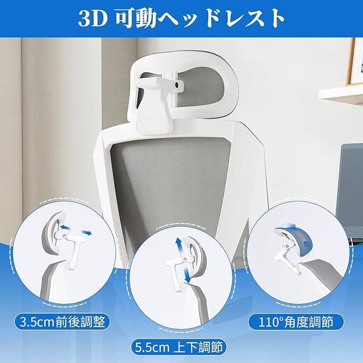 「頭から腰まで自動フィット」3Dヘッドレストは上下5.5cm・前後3.5cm・角度110°の可動設計で、うつむき作業時でも首の動きに合わせて自然に角度が変わり負担を軽減。