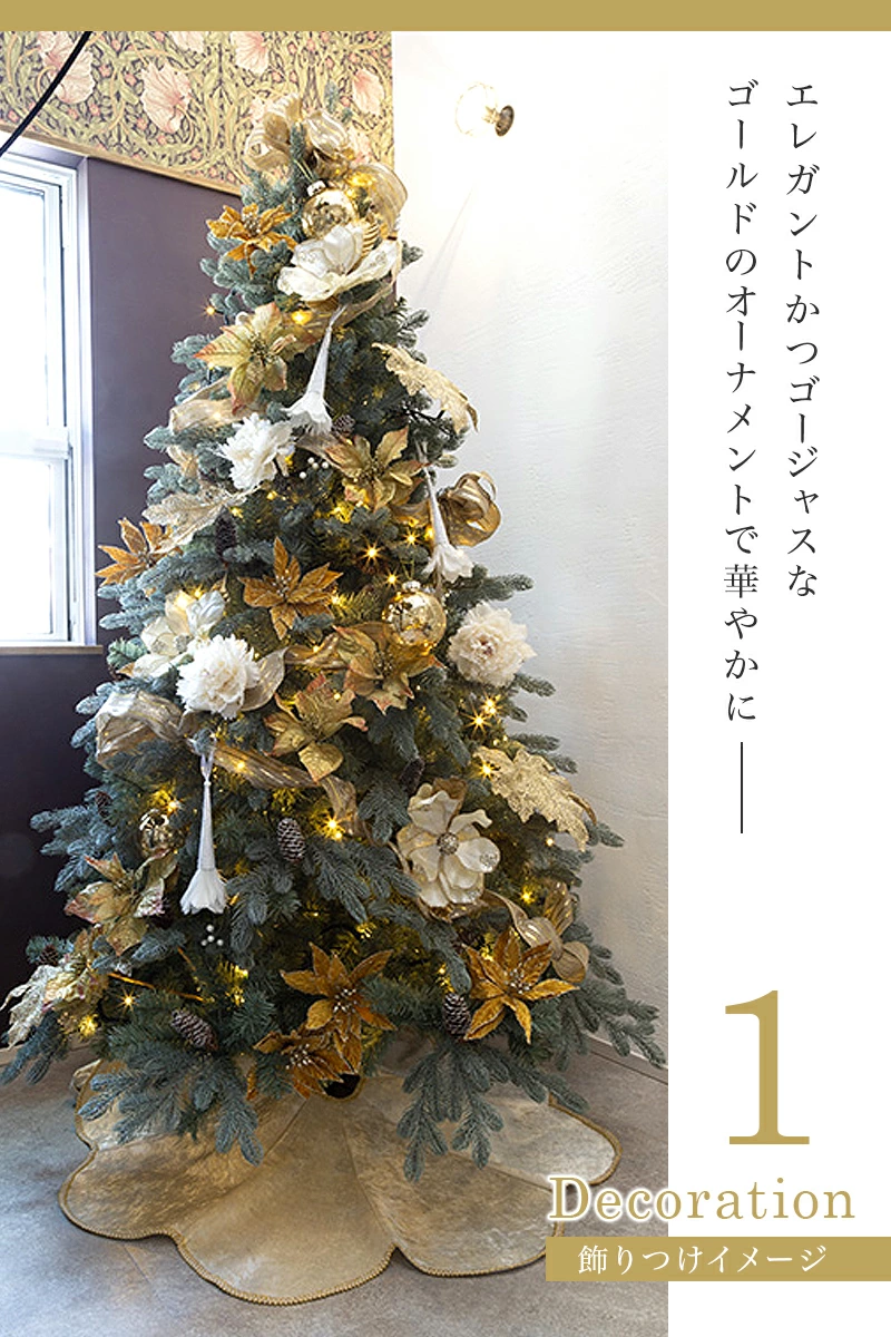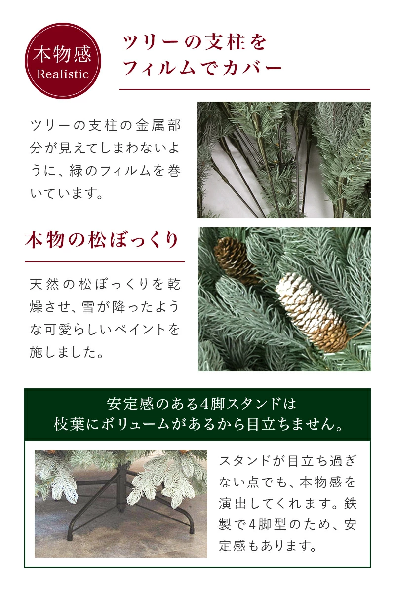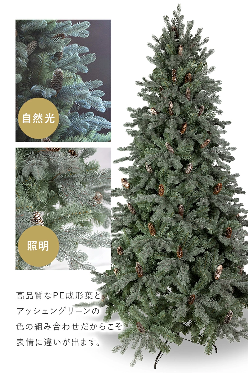 ☆本気で『大人可愛い』を追求したツリー柔らかく高級なポリ成型葉を落ち着いた色合いの灰緑(アッシェングリーン)にしました。可愛らしい色合いのオーナメントはもちろん、派手さを抑えたシンプルなオーナメントまで、ピタッとはまるツリーです。また、灰緑(アッシェングリーン)は明るい陽光のもとでは爽やかで軽やかな雰囲気を演出し、夜の灯りのもとではしっとりと落ち着いた雰囲気になるという二面性を持っています。これは、この色のポリ成型葉が陽光を絶妙に透過させる部分があるというフィルム葉には真似できない性質によるものだと思います。また、松かさに雪が降ったペイントを施し、葉の色と可愛らしくマッチさせています。今年のクリスマスはこのシックで大人可愛いアッシェングリーンをお楽しみください。