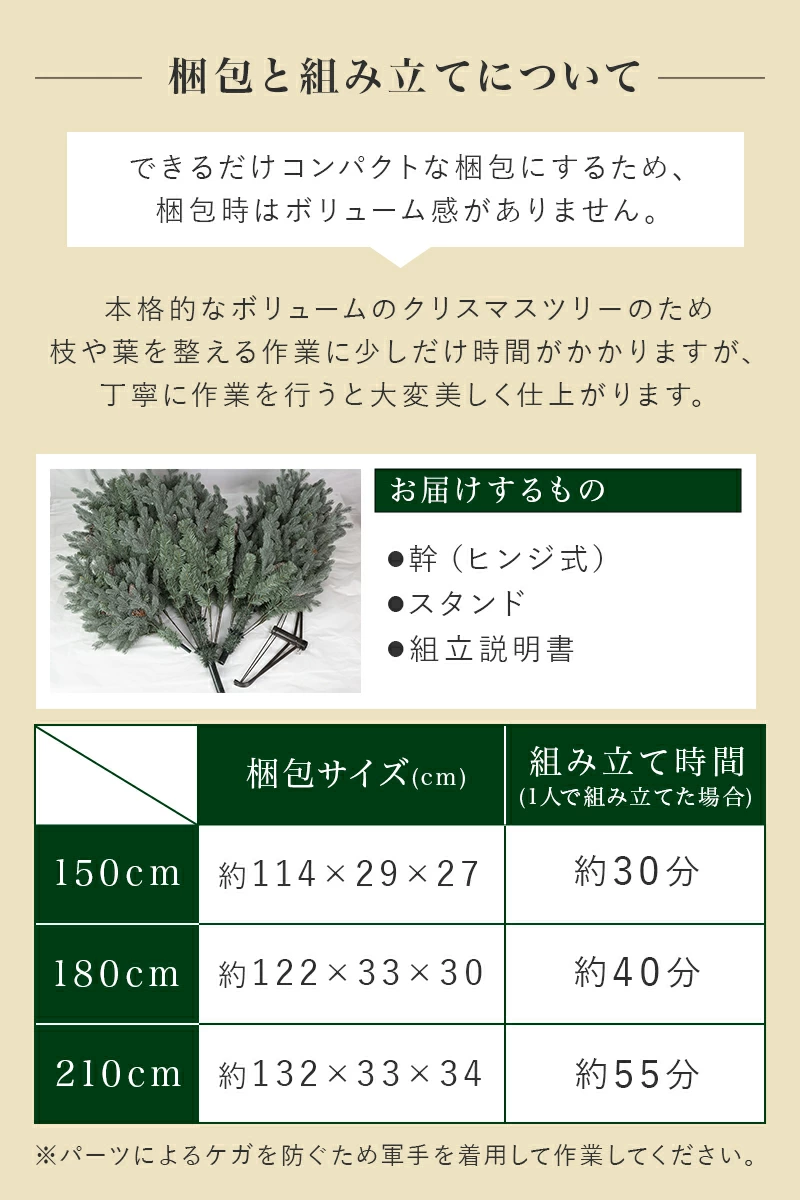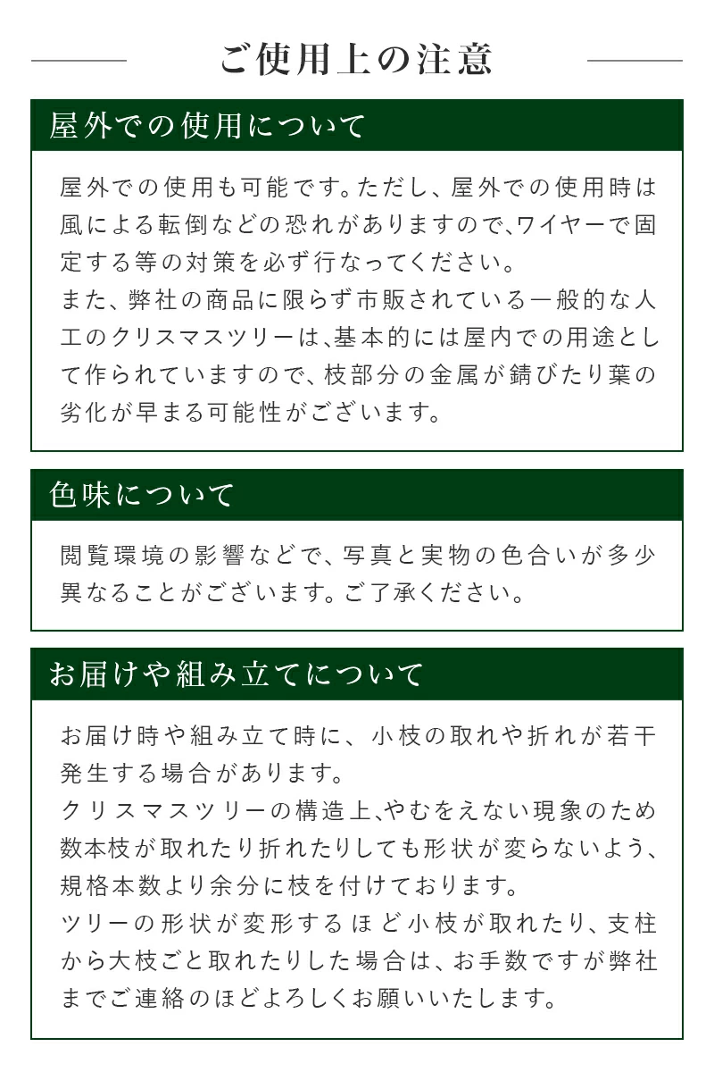 屋外で立てる場合は必ず丈夫な針金か、ワイヤーなどで転倒しないように固定してください。小枝の取れが若干発生する場合がございます。ツリーの構造上やむをえない現象ですので、ご了承願います。ポリ成型葉は、型ではめて作る葉ですので、バリが付いている枝がありますので、ご了承願います。