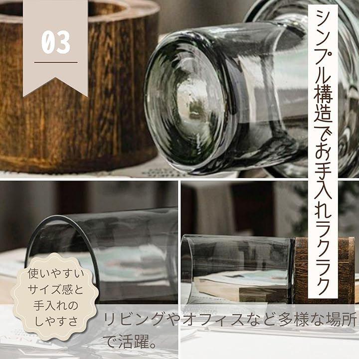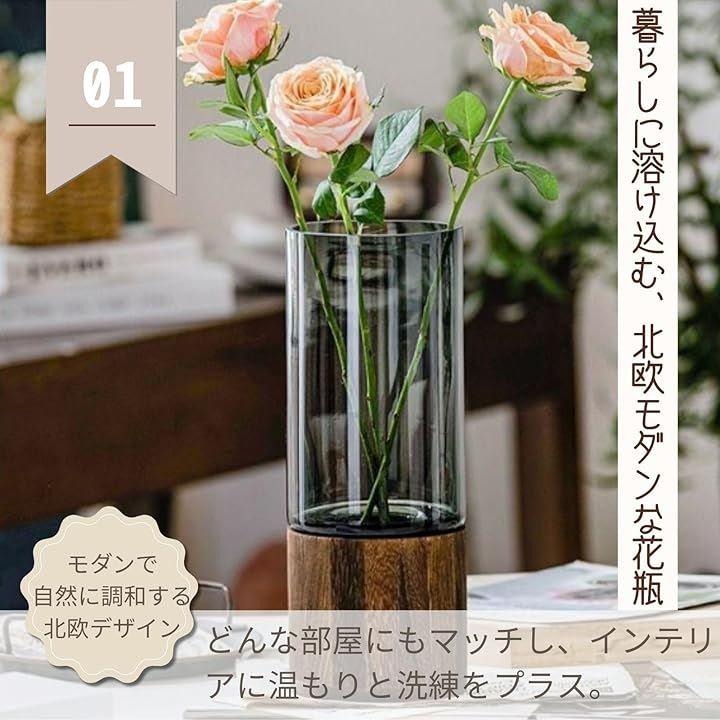 「モダンで自然に調和する北欧デザイン」ダークグレーの半透明ガラスと木製ベースがシンプルかつシックに花を引き立て、どんな空間にも馴染む。