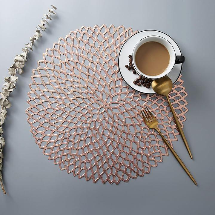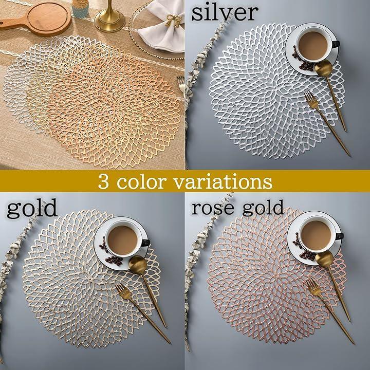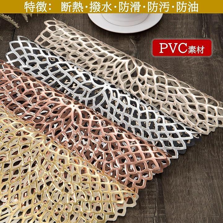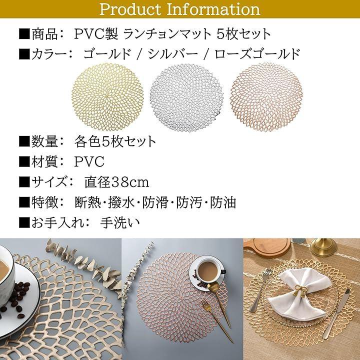 商品詳細:PVC製 ランチョンマット 5枚セット 「カラー」 3種 ゴールド/シルバー/ローズゴールド 「数量」 各色5枚セット 「材質」 PVC 「サイズ」 直径38cm 「重量」 約80g/枚 「特徴」 断熱・撥水・防滑・防汚・防油 「お手入れ」 手洗い
