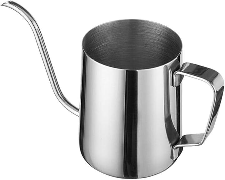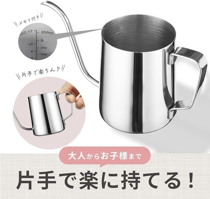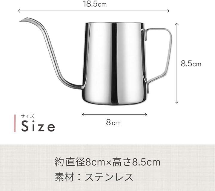「商品詳細」サイズ(約)直径8cmx高さ8.5cmx取手から注ぎ口まで:18.5cm 素材:ステンレス
